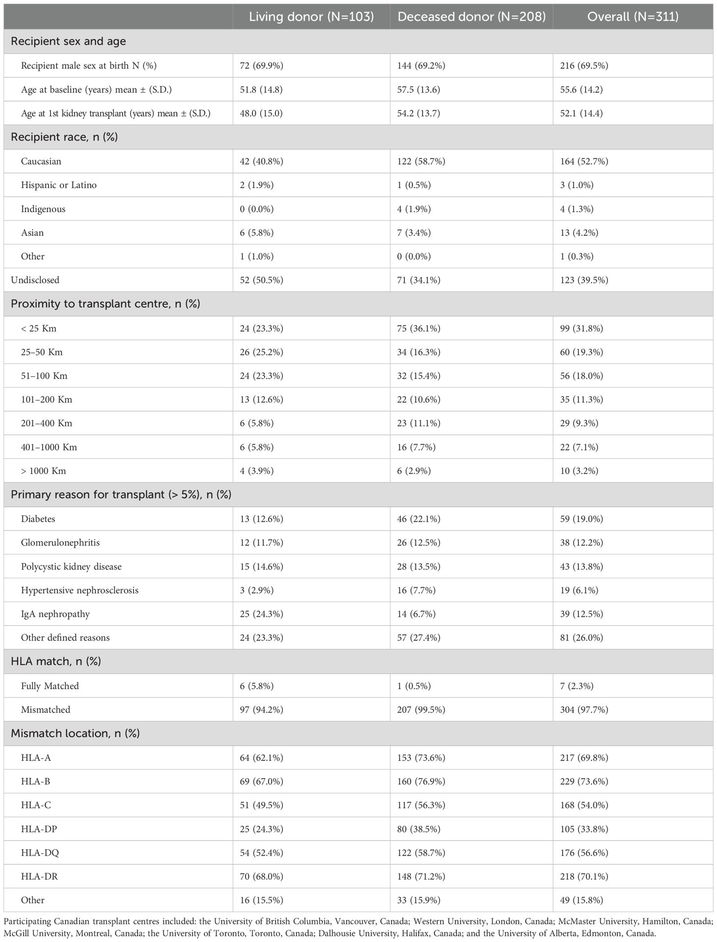 A total of 311 consecutive CMV D+/R- kidney recipients within the index period were enrolled across seven Canadian centers (Table 1). There were no screen failures or exclusions. Of these, 103 received a transplant from a living donor (LD) and 208 from a deceased donor (DD); the median age (IQR) at baseline was 58 (46-67) years and at the first kidney transplant was 55 (42, 64) years; and 69.5% were male and 52.7% were Caucasian. Most participants (68%) lived within 100 km of their transplant center. Primary reasons for kidney failure were diabetes (19.0%), polycystic kidney disease (13.8%), IgA nephropathy (12.5%), other glomerulonephritis (12.2%), or for reasons not specifically defined (26.0%). Most grafts were HLA mismatched (97.7%) with typically two mismatches at HLA-A (44.5%), HLA-B (60.1%), HLA-C (45.4%), HLA-DR (49.6%), HLA-DQ (53.5%) and HLA-DP (47.2%) for those reporting these values. No clinically meaningful differences between those receiving an LD or DD graft were observed with regards to participant baseline characteristics.