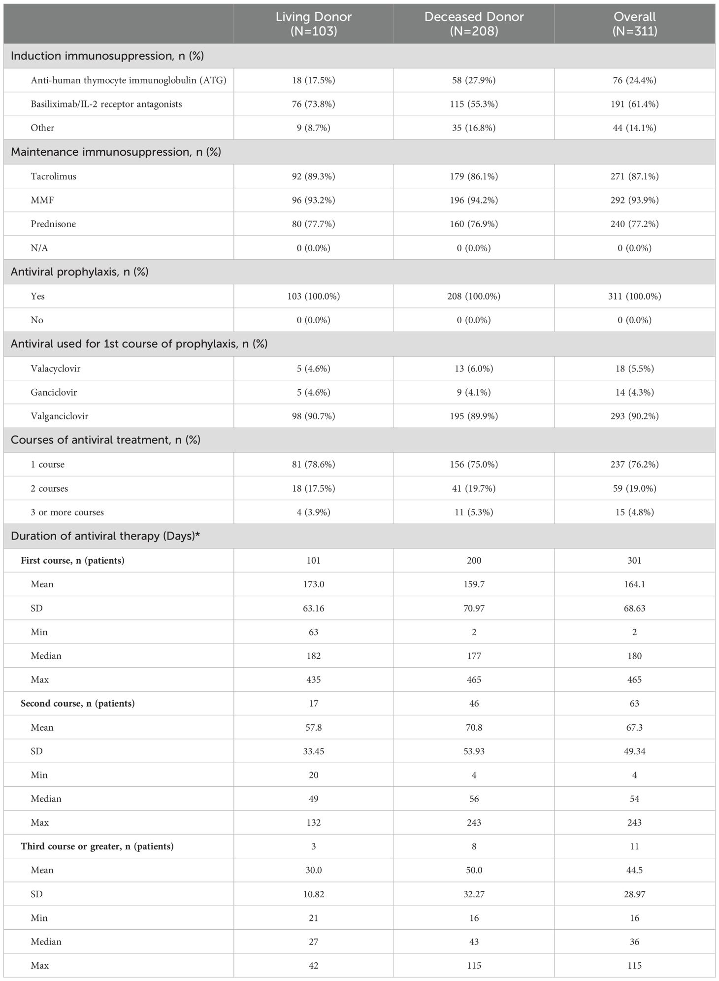 Methods: A retrospective cohort of 311 consecutive CMV D+/R- kidney recipients were enrolled from 7 Canadian programs over 4 years (2018-2021) to provide data on demographic, clinical, therapeutic and health resource use during the 1st year post-transplant.