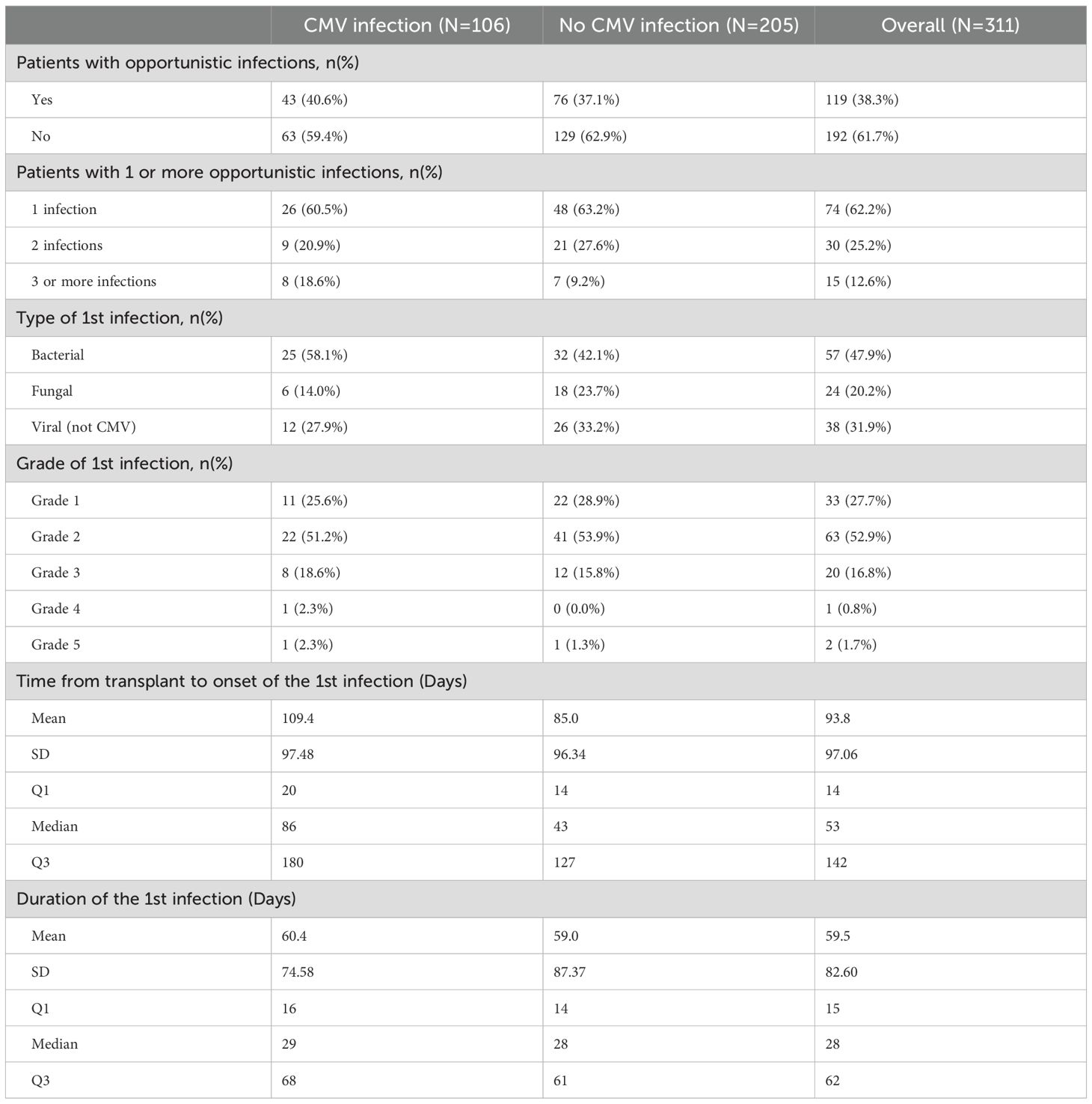 As shown in Table 5, there were no significant differences in the incidence, number of episodes, causal agents or severity of opportunistic infections between patients who did, or did not, experience post-transplant CMV infection (p=NS), Opportunistic infection occurred significantly later in patients with CMV infection (median: 86, IQR: 20, 180 days, p=0.037) than in those without CMV infection (median: 43, IQR: 14, 127 days) though there was no difference in duration of opportunistic infections between the two groups (median: 28 days).
