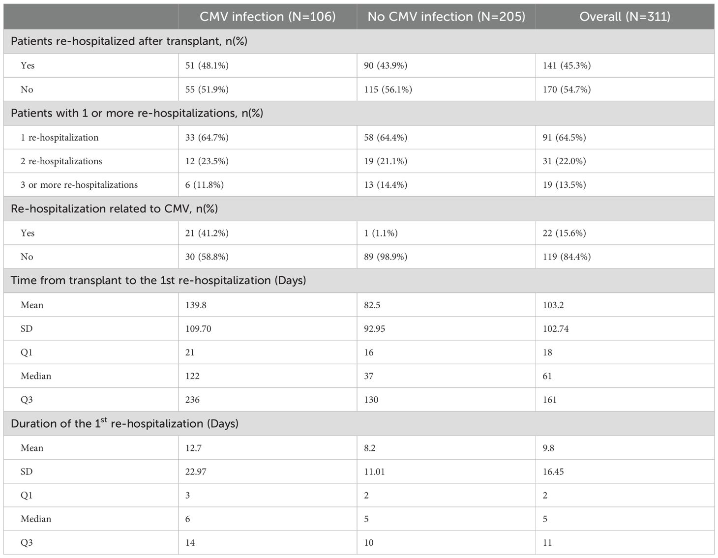 As shown in Table 6, the proportion of patients who were re-hospitalized did not differ significantly between patients with or without CMV infection post-transplant (p=NS), But re-hospitalization occurred substantially later in patients with CMV infection (median: 122, IQR: 21, 236 days, p<0.0001) than in those without CMV infection (median: 37, IQR: 16, 130 days) but there was no difference in duration of hospital stay between the two groups (median: 5 days, p=NS).