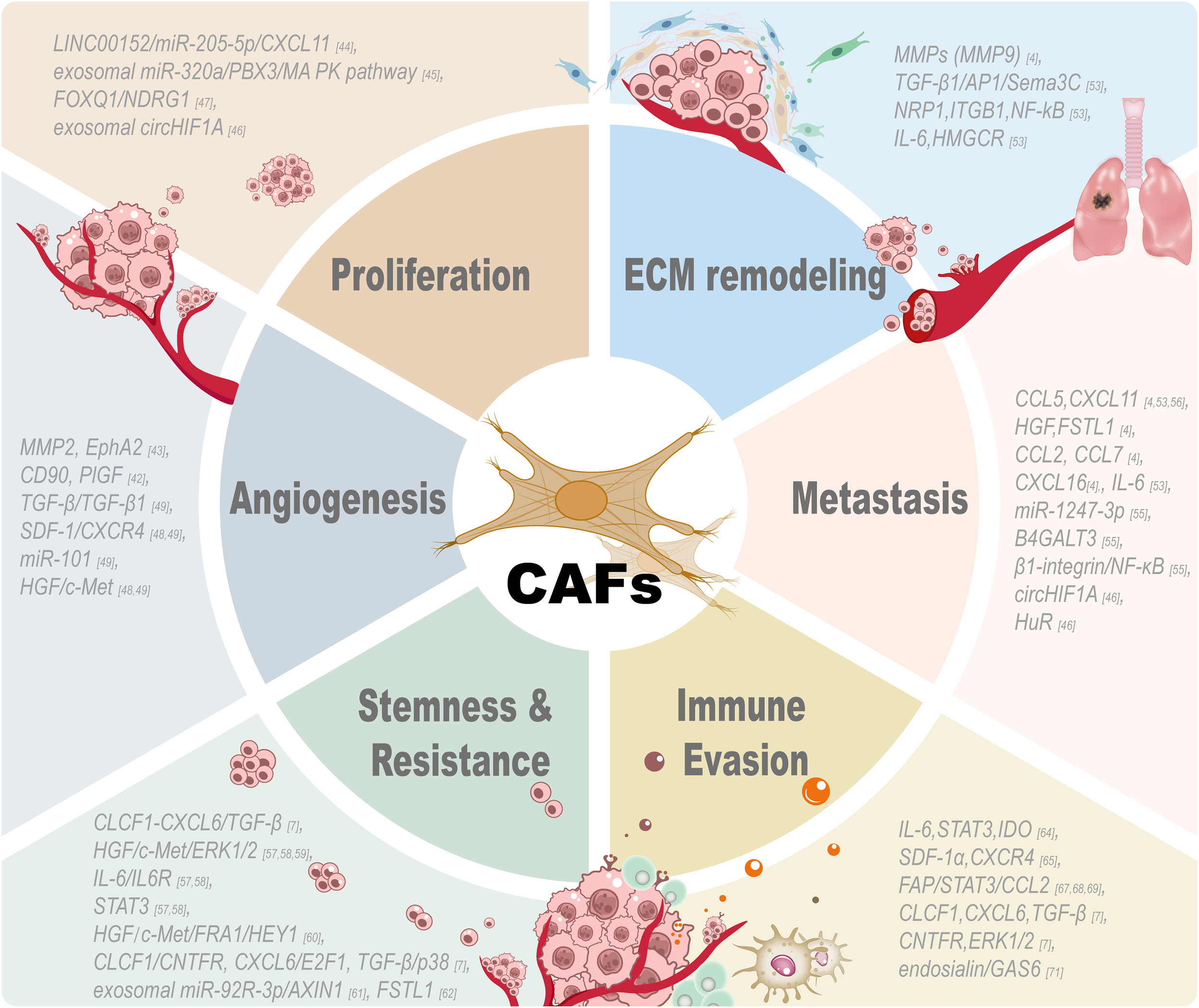 Figure 2. Tumor-associated functions of CAFs. CAF participates in multiple aspects of the tumor microenvironment and exerts great effects on these processes: tumor cell proliferation, extracellular matrix remodeling, angiogenesis, metastasis, stemness, drug resistance and immune evasion. CAF promotes the proliferation of tumor cells by secreting growth factors and signaling proteins. CAFs are indispensable for the stroma and have induced tumor invasion by remodeling the ECM and tumor architecture changes. Angiogenic factors produced by CAFs can promote the growth of new blood vessels and tumor vascularization by stimulating the formation of new blood vessels. CAFs promote the tumor cell metastasis by secreting chemokines to induce the migration of tumor cells. CAFs can maintain the cancer stem cell property and drug resistance of tumor cells through different signaling pathways. CAFs can modulate different kinds of immune cells and participate in the immune evasion process by regulating the immunosuppressive microenvironment created by CAFs to help tumor cells escape from the attack of immune cells. All these results reveal the diversity and important role of CAFs in tumor biology and suggest that targeting these pathways may be an effective approach to treat cancer.