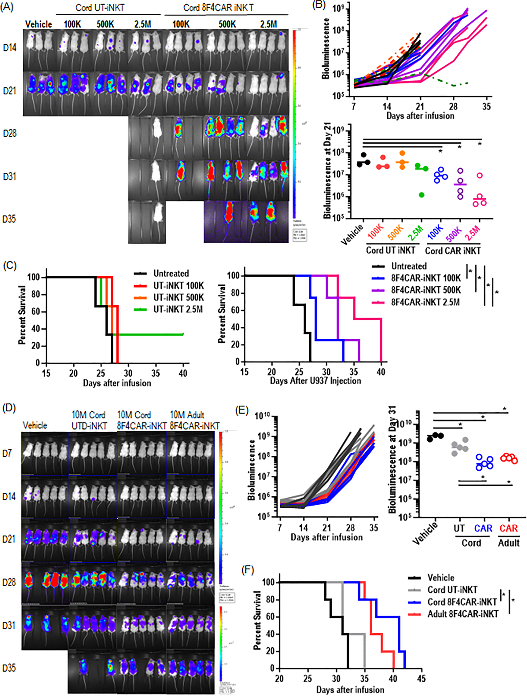 As CB-8F4CAR-iNK T cells are shown to maintain efficient anti-leukemic activity in vitro, we next evaluated the ability of CB-8F4CAR-iNK T cells to control leukemia growth in a xenogeneic AML model. NOD scid gamma (NSG) mice were intravenously injected with U937 HLA-A2+ luciferase-expressing cells on day 0, followed by intravenous treatment of CB-8F4CAR-iNK T cells or donor-matched UT-CB-iNK T cells as a control, three days later. We found that mice treated with CB-8F4CAR-iNK T cells had significantly decreased leukemia burden compared to mice treated with CB-UT-iNK T cells in a dose dependent manner (Figures 5A, B), which lead to the significant survival benefit of mice treated with CB-8F4CAR-iNK T cells compared those treated with control groups, trending in a dose-dependent manner (Figure 5C). Further, mice treated with CB-8F4CAR-iNK T cells exhibited similar leukemia reduction and survival benefit compared to mice treated with AD-8F4CAR-iNK T cells at the same dose (Figures 5D-F). There were no visible indications of graft-versus-host disease-like symptoms observed, and mouse weight remained stable in all groups (data not shown).