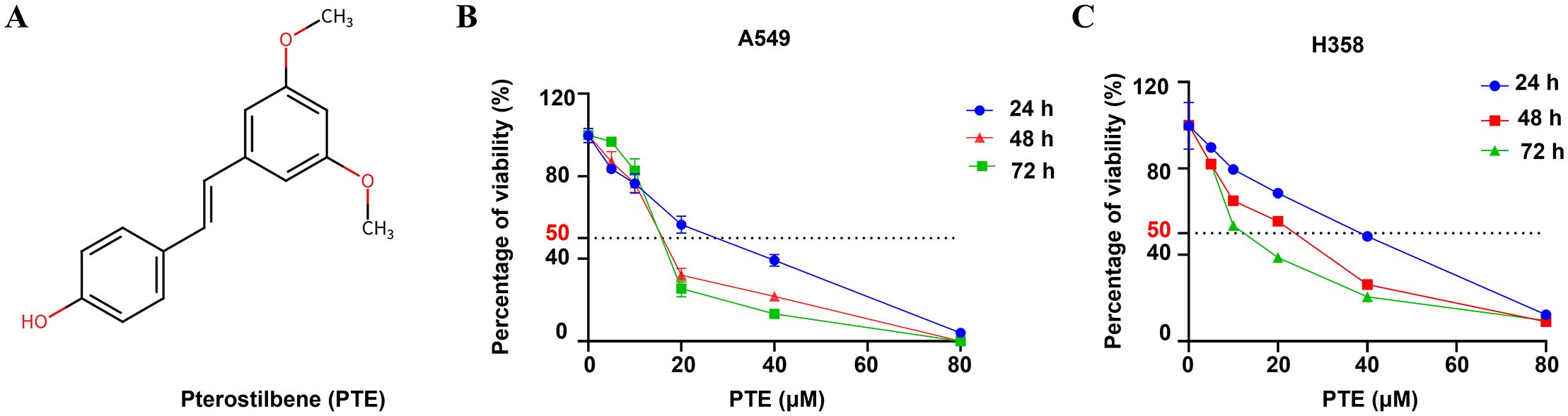 The chemical structure of pterostilbene (PTE) is shown in Figure 1A. We evaluated its effects on cell viability using CCK-8 assays in A549 and H358 NSCLC cells treated with various concentrations of PTE (0-40 µM) for 24, 48, and 72 hours. PTE significantly inhibited cell viability in both cell lines in a concentration- and time-dependent manner (Figures 1B, C).