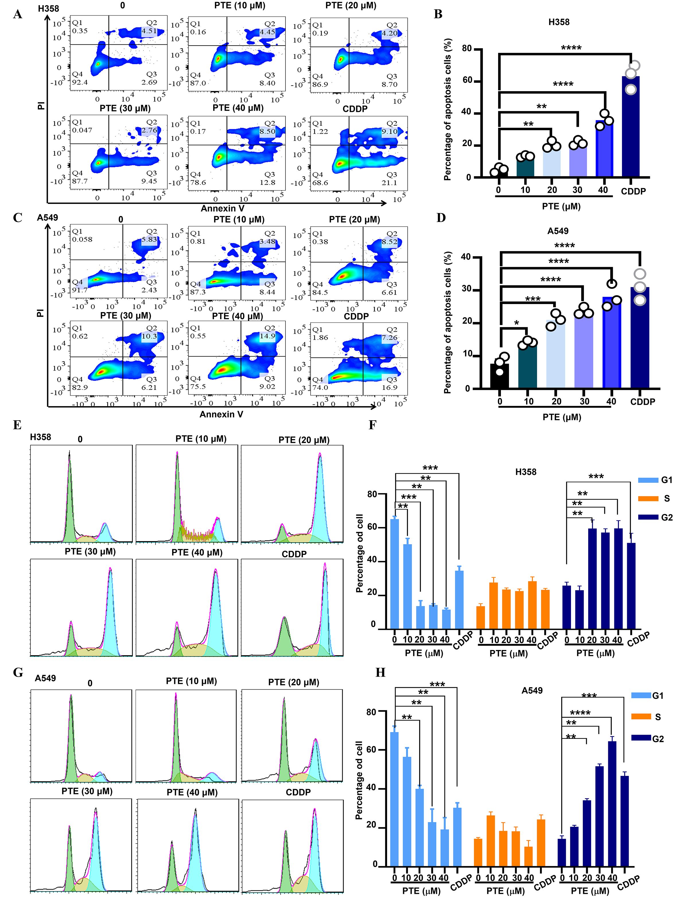 Figure 3. PTE exhibited a significant increase apoptosis in NSCLC cells. (A-D) A549 and H358 cells were treated with PTE at concentrations of 10, 20, 30 and 40 μM for 24 hours. The analysis of cell apoptosis in these NSCLC cells was conducted using BD Annexin V/PI staining followed by flow cytometry, demonstrating the apoptotic effects of PTE treatment. (E-H) The impact of PTE on cell cycle progression was also assessed in A549 and H358 cells after 24-hours treatments. Cells were stained with PI and analyzed with flow cytometry to determine cell cycle arrest. Data are presented as the percentage of cells in each phase of the cell cycle (G1, S, and G2/M phases). Statistical significance is indicated by *P < 0.05, **P < 0.01, ***P < 0.001 and **** P < 0.0001.