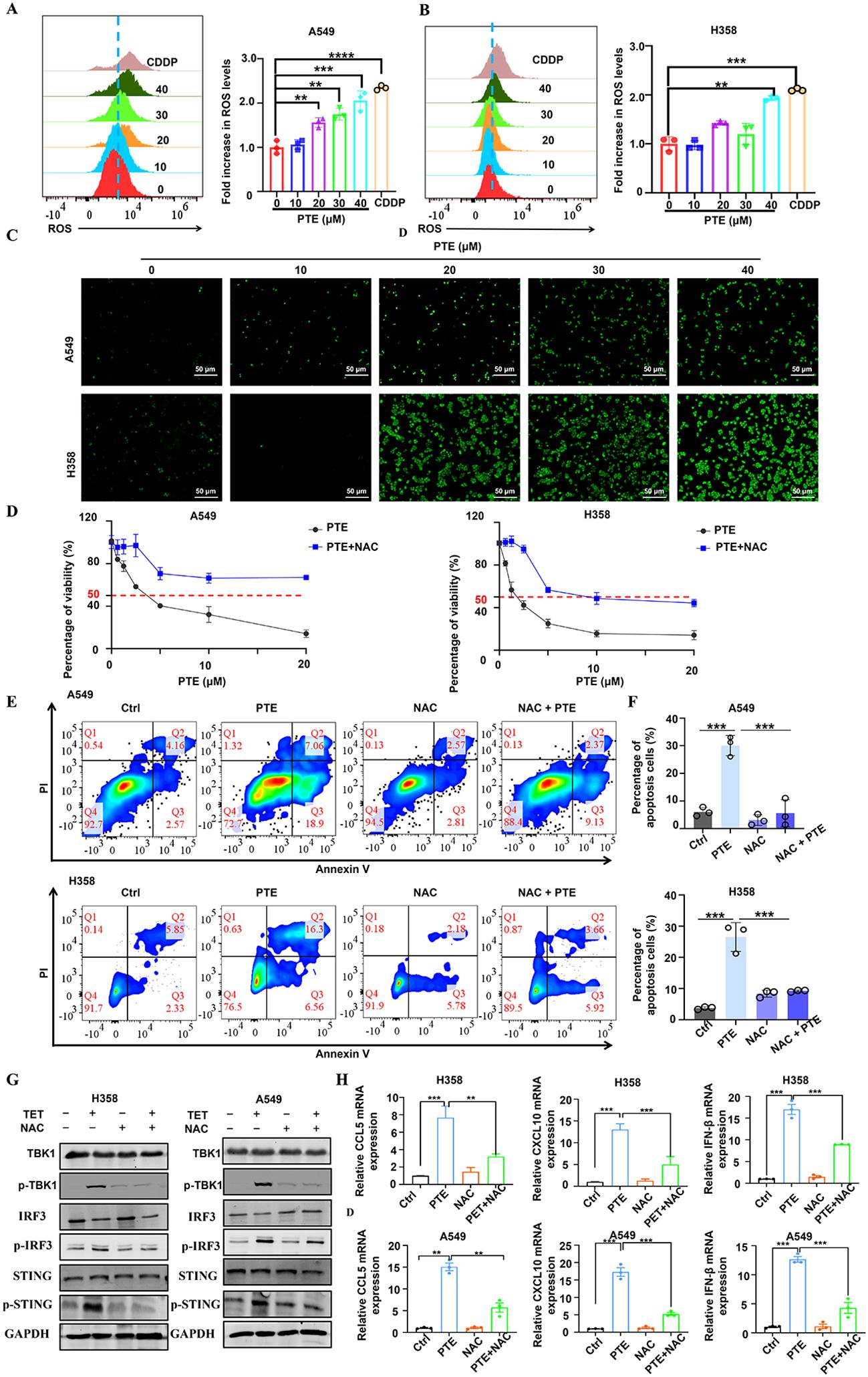Figure 4. PTE induced mitochondrial dysfunction and induced ROS production in NSCLC cells. (A, B) A549 and H358 cells were treated with PTE for 24 hours, and ROS levels were measured using DCFDA staining followed by flow cytometry analysis, indicating a significant increase in ROS levels. (C) The expression of reactive oxygen species (ROS) in A549 and H358 cell lines was further evaluated using immunofluorescence techniques after 24 hours of PTE treatment, confirming elevated ROS levels. (D) A549 and H358 cells were pre-incubated with 5 mM NAC for 1 hour prior to treatment with PTE for 24 hours, and cell proliferation was assessed using the CCK8 assay, demonstrating that NAC pretreatment reversed the inhibitory effects of PTE. (E, F) Additionally, A549 and H358 cells were pre-incubated with 5 mM NAC for 1 hour before PTE treatment for 24 hours, and cell apoptosis was evaluated using flow cytometry, further elucidating the role of ROS in PTE-induced apoptosis. (G) A549 and H358 cells were pre-incubated with 5 mM NAC for 1 hour before PTE treatment for 24 hours. Western blot analysis was conducted to assess the protein expression levels of p-STING, STING, p-TBK1, TBK1, p-IRF3, IRF3, and GAPDH. (H) A549 and H358 cells were pre-incubated with 5 mM NAC for 1 hour before PTE treatment for 24 hours, mRNA expression levels of C-C motif chemokine ligand 5 (CCL5), C-X-C motif chemokine ligand 10 (CXCL10), C-X-C motif chemokine ligand 9 (CXCL9), and interferon beta (IFN-β) was examined with RT-PCR. Data were presented as the mean ± S.D. from three independent experiments. *P < 0.05, **P < 0.01, ***P < 0.001 and ****P < 0.0001.