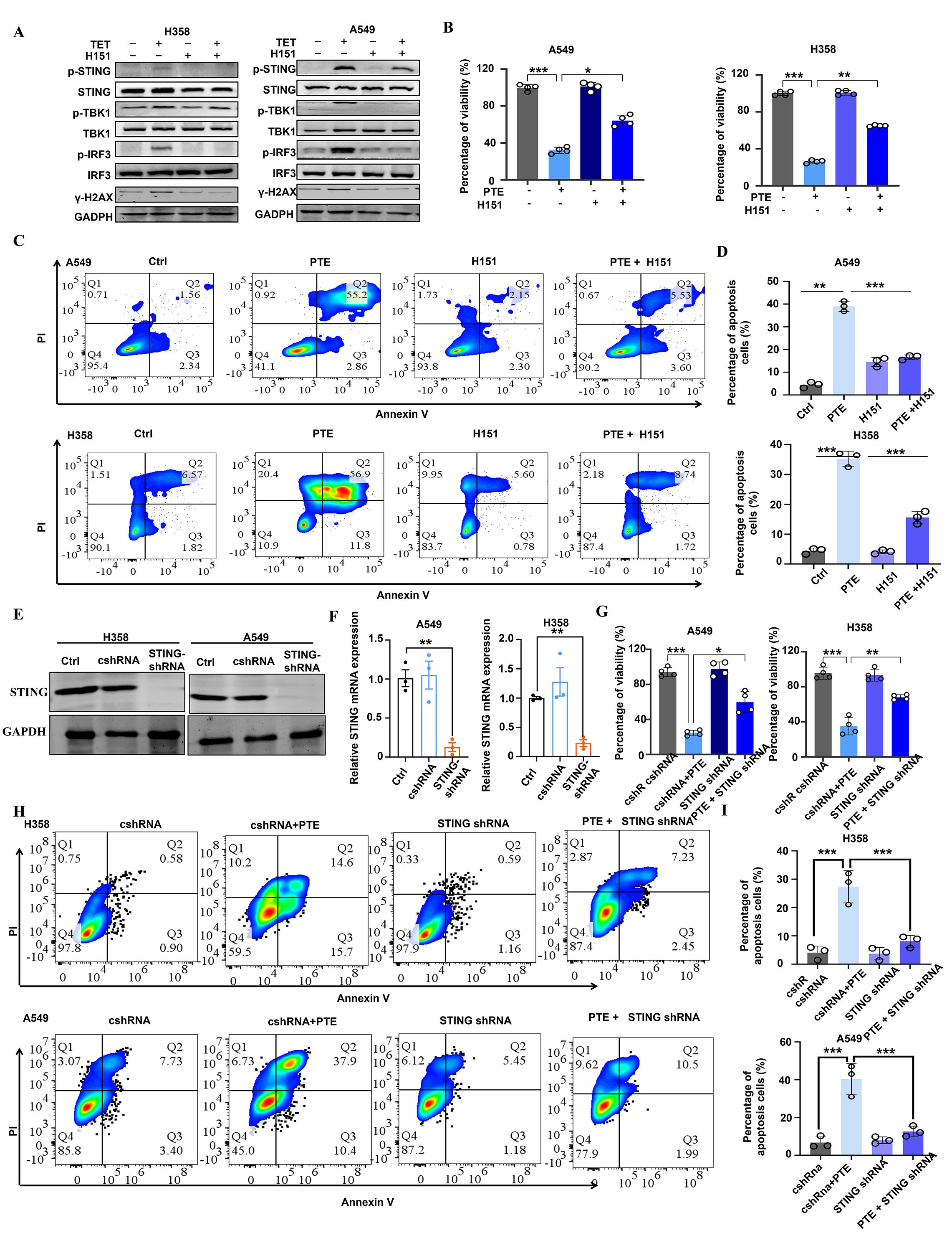 Figure 5. PTE significantly activated the STING pathway in NSCLC. (A) A549 and H358 cells were pre-incubated with H-151 for 1 hour prior to treatment with PTE for 24 hours. Western blot analysis was conducted to assess the protein expression levels of p-STING, STING, p-TBK1, TBK1, p-IRF3, IRF3, and GAPDH. (B) Following the same pre-incubation with H-151 for 1 hour, the cell proliferation of A549 and H358 cell lines was evaluated using the CCK-8 assay after 24 hours of PTE treatment. (C, D) Cell apoptosis in A549 and H358 cells was analyzed using flow cytometry following the preincubation with H-151 and subsequent PTE treatment for 24 hours. (E) The Western blot assay results show that STING was successfully knocked down in H358 and A549 cells. (F) RT-PCR assay showed that STING mRNA expression was decreased in H358 and A549 cells after treated with STING shRNA. (G) The cell viability of H358 and A549 cells subjected to the knockdown of STING with the indicated doses of PTE treatment for 48 h was assessed with the MTT method. (H, I) Cell apoptosis in A549 and H358 cells subjected to the knockdown of STING with the indicated doses of PTE treatment for 48 hours was assessed with using flow cytometry. Data were presented as the mean ± S.D. from three independent experiments. *P < 0.05, **P < 0.01, ***P < 0.001 and ****P < 0.0001.