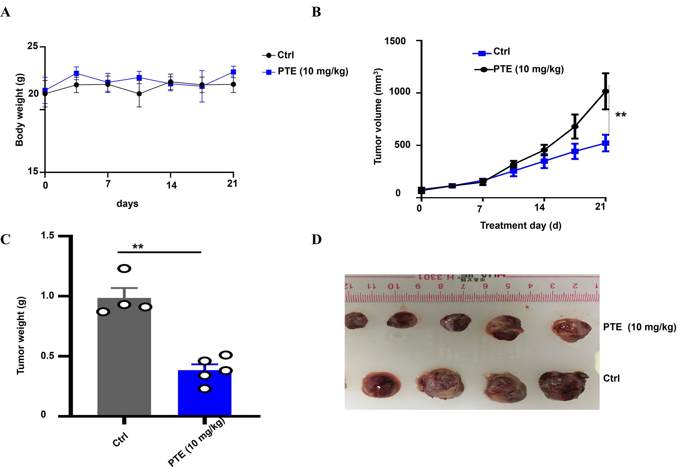 Notably, PTE treatment significantly suppressed tumor growth compared to the vehicle control. A statistically significant reduction in tumor volume became apparent from day 14 post-treatment onward (Figure 6B). At the endpoint, tumors resected from the PTE -treated group were both visibly smaller (Figure 6C) and had significantly lower weights than those from the control group (Figure 6D). These consistent results across volume and weight measurements robustly demonstrate the inhibitory effect of PTE on NSCLC tumor progression in vivo. In summary, these findings indicated that PTE effectively restrained tumor growth in a xenograft model without eliciting overt adverse effects, underscoring its potential as a promising therapeutic candidate for NSCLC treatment.