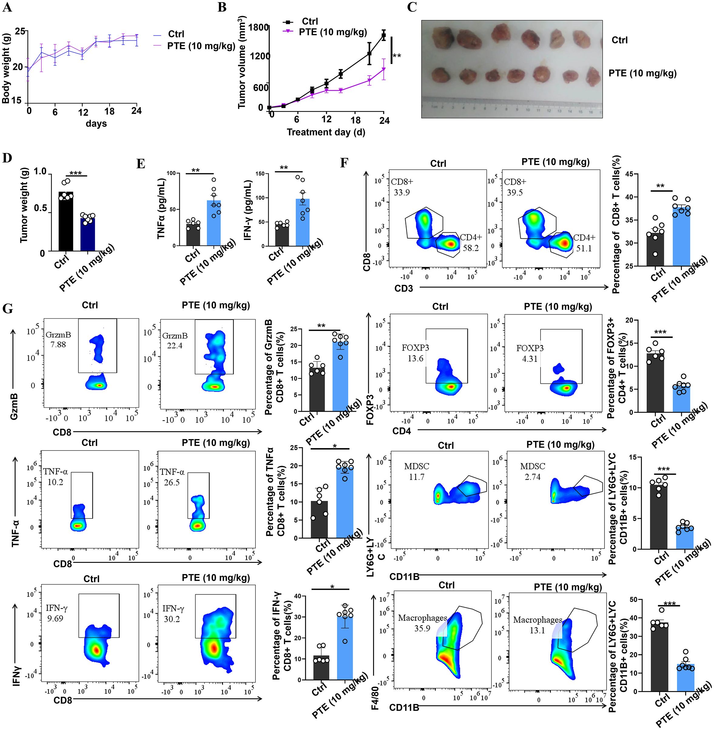 Figure 7. PTE treatment was found to inhibit tumor growth by enhancing the presence of CD8+ T cells in vivo. (A) Body weight change curve of NSCLC mice treated with either vehicle or PTE, showing no significant weight loss in the PTE-treated group. (B) Tumor volume in the NSCLC mouse model was evaluated from the beginning of the treatment period, illustrating tumor suppression in the PTE-treated group compared to the control. (C) Photographs of tumor samples from each group, highlighting the reduced size of tumors in the PTE treatment group. (D) Measurement of tumor weights in NSCLC mice on day 24 post-treatment, confirming significant reduction in tumor weight in the PTE group relative to the control group. (E) ELISA results displaying quantified levels of TNF-α and IFN-γ in plasma, indicating elevated cytokine levels following PTE treatment. (F) Flow cytometry analysis demonstrating the distribution of CD8+ T cells in tumor tissues. (G) Flow cytometry analysis demonstrating the distribution of CD8+ T cells in tumor tissues and assessing the expression of TNF-α, granzyme B (GzmB), and IFN-γ among CD8+ T cells, along with the evaluation of Tregs, MDSCs, and tumor-infiltrating macrophages in control versus PTE treatment groups. Flow cytometric data was compared among the groups, with statistical significance denoted by P values (*P < 0.05, **P < 0.01, ***P < 0.001, and ****P < 0.0001).
