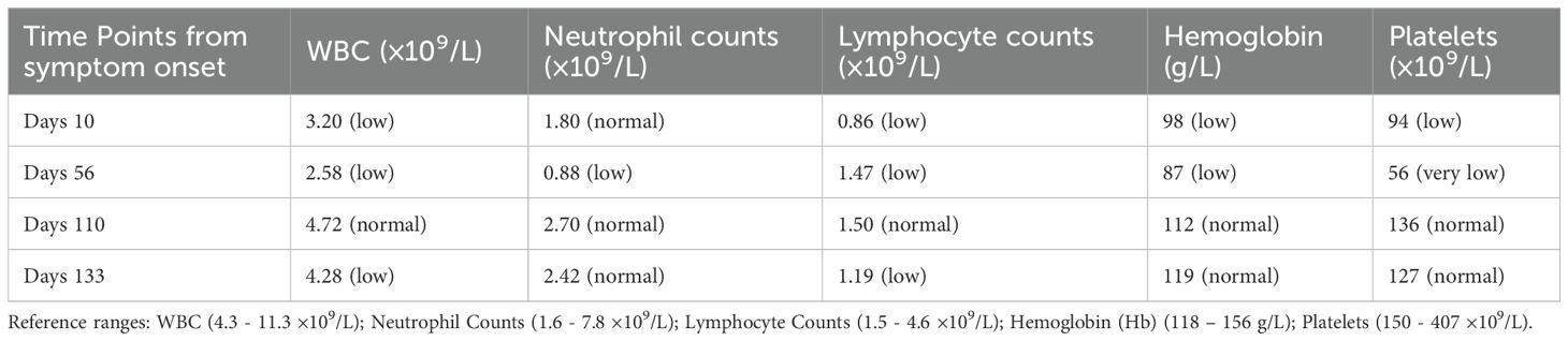 Initial laboratory evaluation revealed mild leukopenia (WBC 3.2×109/L), reduced lymphocyte count (0.86×109/L), and borderline low neutrophil count (1.8×109/L), along with mild thrombocytopenia (platelet count 94×109/L) and anemia (Hb 98g/L). Inflammatory markers were mild elevated, with a C-reactive protein (CRP) level of 10.68 mg/L and erythrocyte sedimentation rate (ESR) of 27mm/h. Liver and renal function panels were within normal limits.