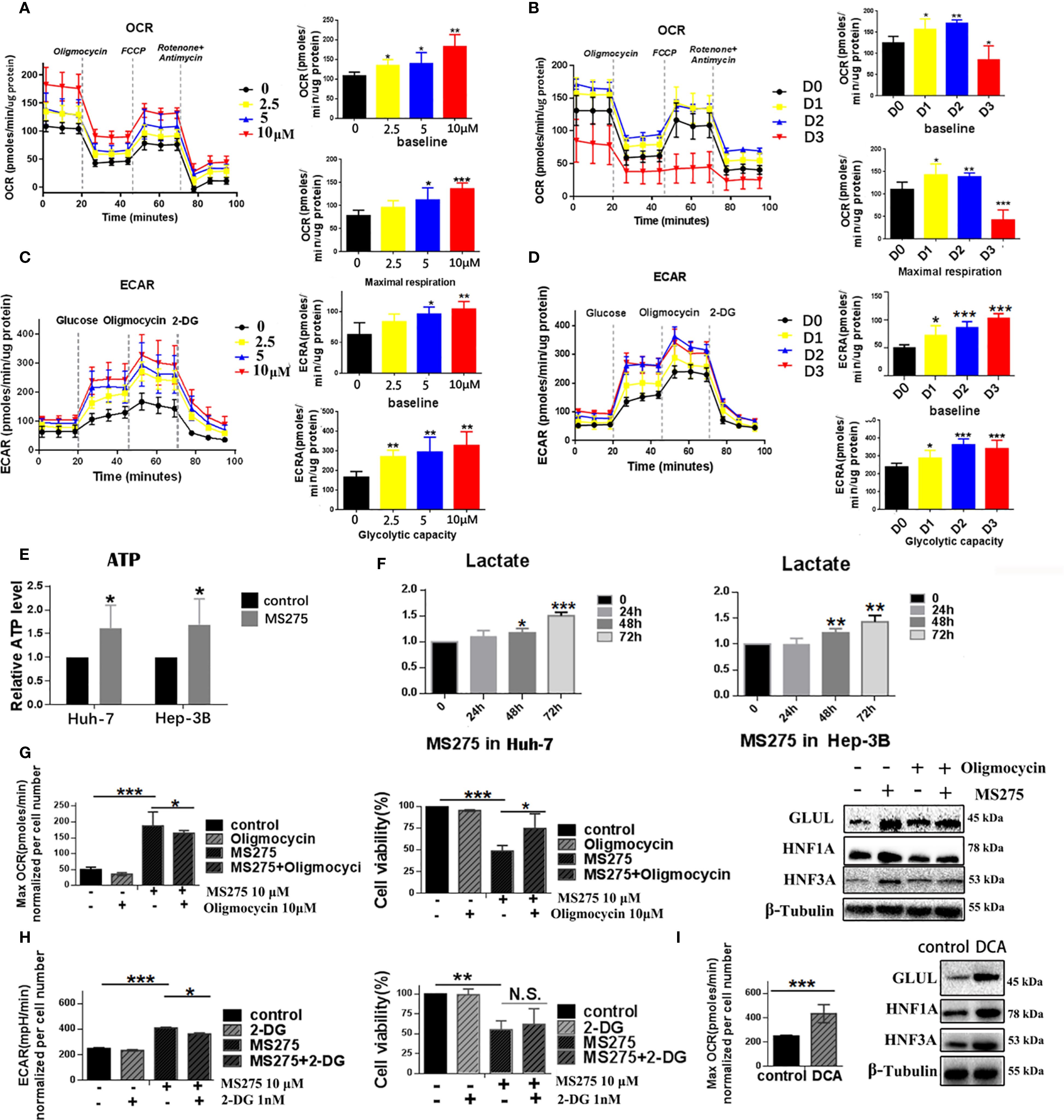 Figure 3. HDACi MS275 reprogramme the glycometabolism, characterized by stimulated glycolysis and oxidative phosphorylation. (A, B) OCR measurements in HUH-7 (A) and Hep-3B (B) cells treated with different concentrations of MS275, demonstrating increased baseline and maximal respiration in a dose- and time-dependent manner. (C, D) ECAR measurements in HUH-7 (C) and Hep-3B (D) cells treated with MS275, showing an increase in glycolysis and glycolytic capacity in a dose- and time-dependent manner. (E) Relative ATP levels in HUH-7 and Hep-3B cells, showing increased ATP production in response to MS275 treatment. (F) Lactate production in HUH-7 and Hep-3B cells, demonstrating an induction in glycolysis-derived lactate following MS275 treatment over time. (G) Effect of the oxidative phosphorylation inhibitor oligomycin on MS275-treated cells, showing reduced OCR and cell viability. (H) Effect of the glycolysis inhibitor 2-DG on MS275-treated cells, indicating that glycolysis inhibition further reduces ECAR but did not significantly affect MS275-induced growth suppression at low doses. (I) Treatment with the mitochondrial pyruvate carrier inhibitor DCA increased maximal OCR and the expression of metabolic markers (GLUL, HNF3A, and HNF1A) *: p<0.05 ; **: p<0.01; ***: p<0.001.