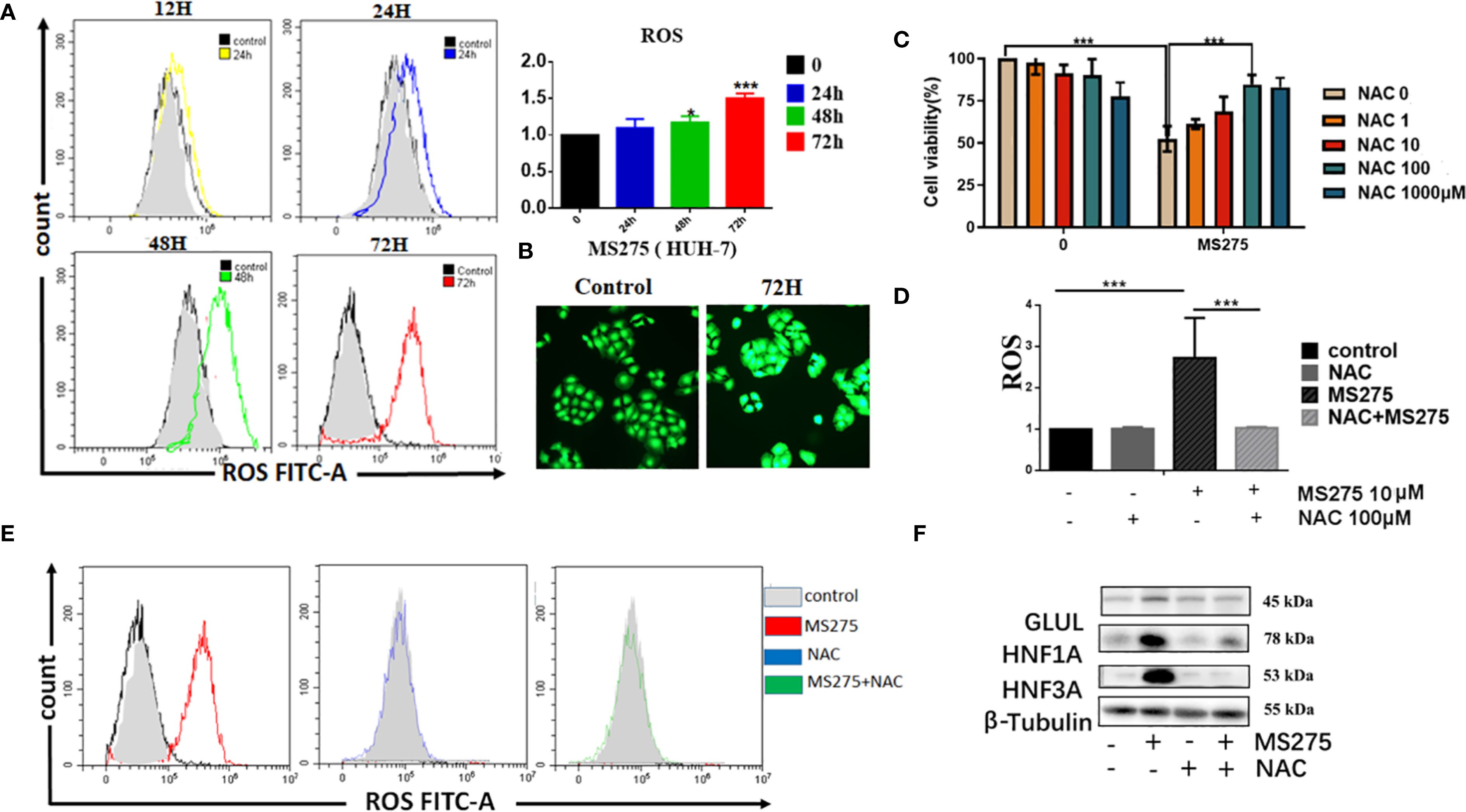 Figure 4. ROS production by boosted oxygen phosphorylation is responsible for MS275 induced differentiation and proliferation-loss. (A) Flow cytometry analysis of ROS levels in HUH-7 cells treated with MS275 for 12, 24, 48, and 72 hours, showing a time-dependent increase in ROS production. (B) Immunofluorescence images of ROS in control and MS275-treated cells at 72 hours, showing elevated ROS levels. (C) Cell viability assay demonstrating that MS275 reduced cell viability, while NAC partially rescued cell survival, suggesting that ROS contributes to MS275-induced proliferation inhibition. (D) Quantification of ROS levels in cells treated with MS275 alone or co-treated with NAC, showing that NAC effectively reduced ROS production. (E) Flow cytometry analysis of mitochondrial ROS levels in control, MS275, NAC, and MS275+NAC-treated cells, confirming that MS275-induced ROS was mitochondrial-derived. (F) Western blot analysis of differentiation markers (GLUL, HNF1A, HNF3A) in control and MS275-treated cells, with or without NAC, showing that ROS inhibition suppressed MS275-induced differentiation *: p<0.05; ***: p<0.001.