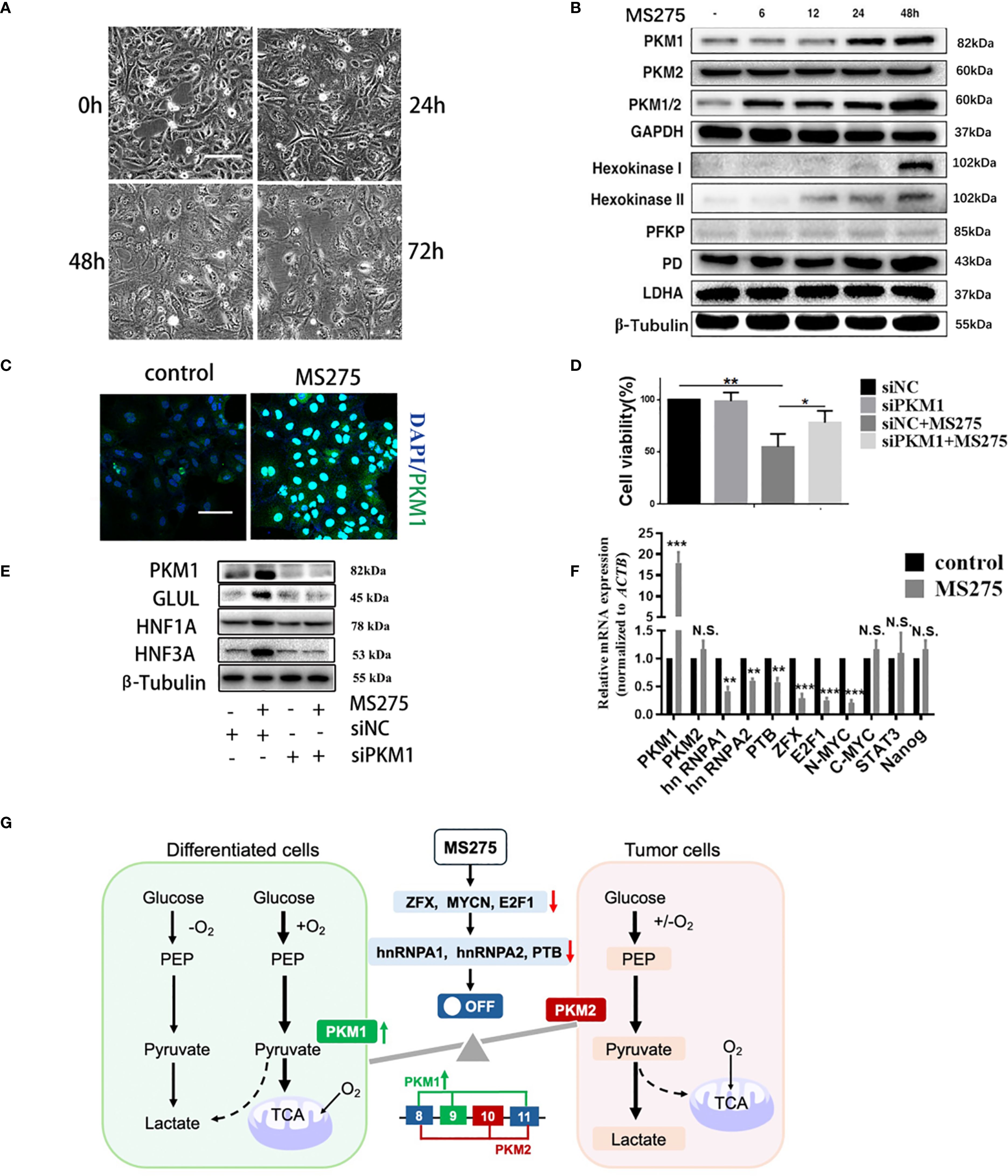 Figure 5. PKM1 expression contributes to ROS production and cell differentiation by MS275. (A) Morphological changes over time (0h, 24h, 48h, 72h) after MS275 treatment. (B) Western blot analysis showing time-dependent upregulation of PKM1 and metabolic enzymes involved in oxidative phosphorylation and glycolysis in MS275-treated cells. (C) Immunofluorescence images showing increased PKM1 expression in MS275-treated cells compared to controls. (D) Cell viability assay showing reduced proliferation upon MS275 treatment, suggesting that PKM1 upregulation contributed to growth inhibition. (E) Western blot analysis of PKM1, GLUL, HNF1A, and HNF3A in control, MS275-treated, siPKM1, and siPKM1+MS275-treated cells, indicating that PKM1 knockdown blocked MS275-induced differentiation. (F) qRT-PCR analysis of metabolic and differentiation-related genes in control and MS275-treated cells, showing significant upregulation of PKM1 and differentiation markers. (G) Schematic representation of PKM1’s role in oxidative phosphorylation and glycolysis, showing how PKM1-mediated oxidative metabolism promotes differentiation and inhibits proliferation in HCC cells *: p<0.05 ; **: p<0.01; ***: p<0.001. "N.S" means not significant.