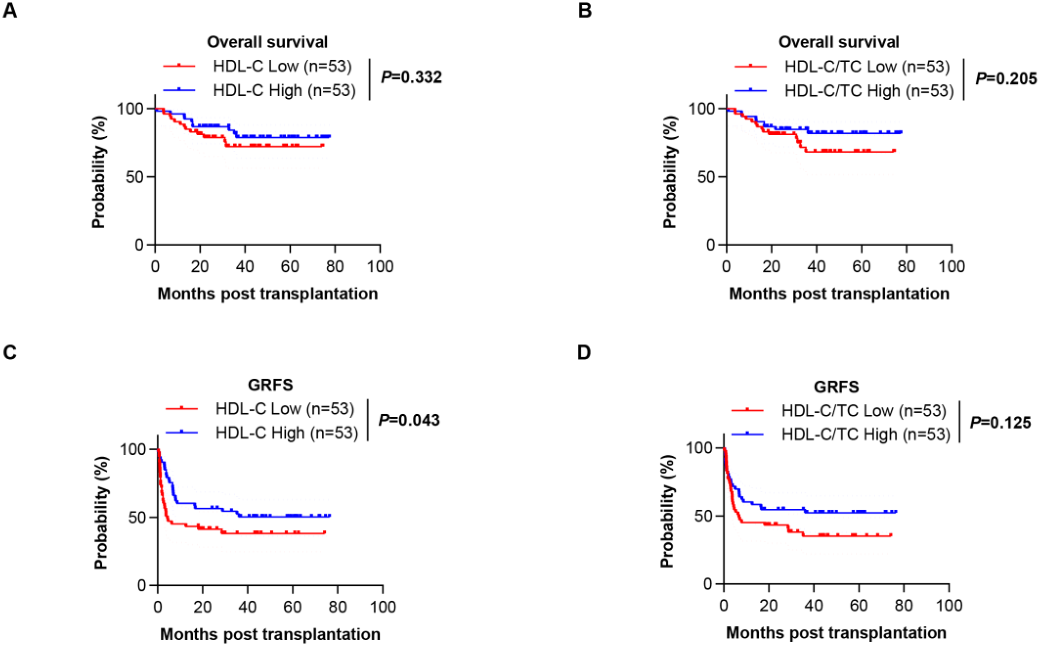 In conclusion, our study showed that lower HDL-C levels were associated with a higher incidence of GVHD. Clinical manifestations of altered HDL-C levels need to be recognized independently. Further prospective evaluation of lipid abnormalities is thus warranted.