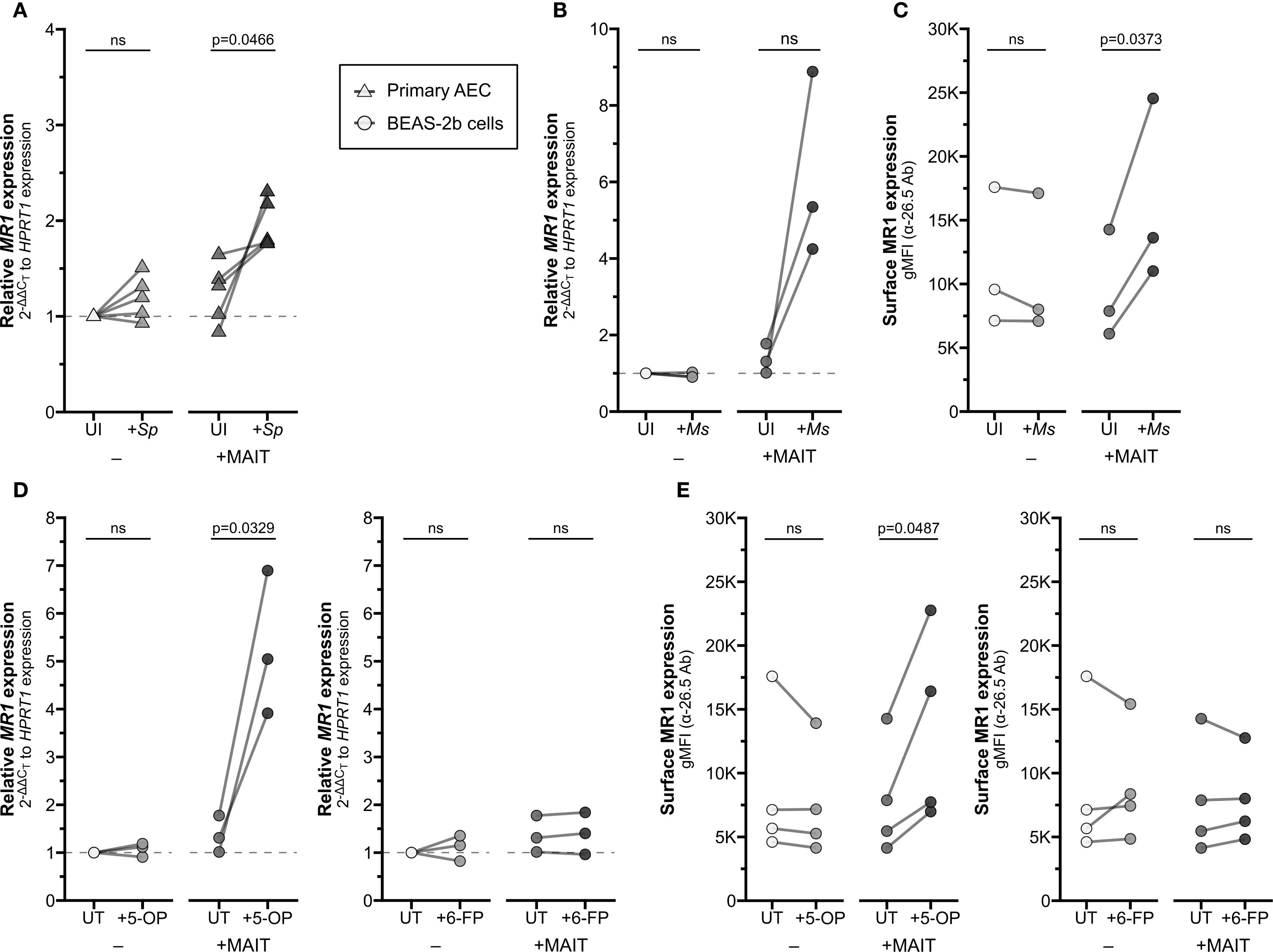 Figure 1. Increased MR1 expression following MAIT cell activation. (A) RT-qPCR of RNA isolated from primary human AECs (n=5) infected with S. pneumoniae (Sp) for one hour and incubated overnight with MAIT cell clone. MR1 expression was calculated relative to HPRT1 expression and uninfected no-MAIT (UI-) controls, paired by individual donor. MR1 (B) mRNA and (C) surface expression of BEAS-2B cells infected with M. smegmatis (Ms) for one hour and incubated overnight with MAIT cell clone. (B) RT-qPCR of MR1 expression was calculated relative to HPRT1 expression and UI- control, paired by experimental replicate. (C) Geometric mean fluorescence intensity (gMFI) of surface MR1 stained with α-MR1 26.5 Ab, paired by experimental replicate. MR1 (D) mRNA and (E) surface expression of BEAS-2B cells treated with 5-OP-RU (left, “5−OP”) or 6-FP (right) for one hour and incubated overnight with MAIT cell clone. (D) RT-qPCR of MR1 expression was calculated relative to HPRT1 expression and UT- control, paired by experimental replicate. (E) gMFI of surface MR1 stained with α-26.5 Ab, paired by experimental replicate. Pairwise statistical analyses are in Supplementary Table 1. Triangles represent data from primary AEC and circles represent data from BEAS-2B cells. The symbol 'ns' refers to comparisons with p-values < 0.05.
