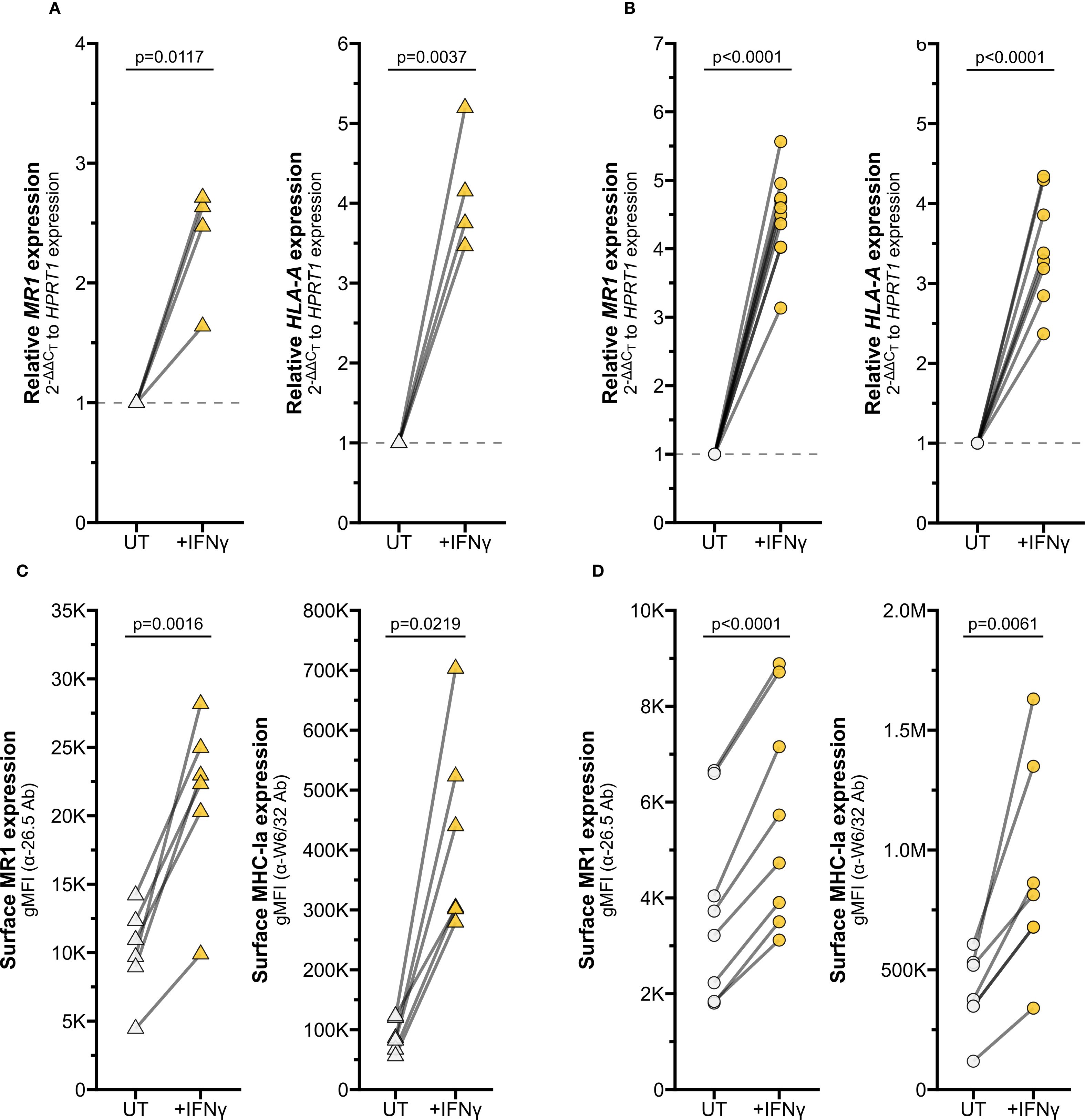Figure 2. IFNγ induces MR1 expression and function. RT-qPCR of (A) primary human AECs or (B) BEAS-2B cells treated with media control (UT) or recombinant IFNγ for 12 hours. MR1 (left) and HLA-A (right) expression were calculated relative to HPRT1 expression and UT control, paired by individual donor or experimental replicate. Flow cytometry of (C) primary AECs or (D) BEAS-2B cells treated with recombinant IFNγ for 12 hours. gMFI of surface MR1 (left, α-26.5 Ab) and MHC-Ia (right, α-W6/32 Ab) are paired by individual donor or experimental replicate. Pairwise T tests were performed by donor (A, C) or experiment (B, D). Triangles represent data from primary AEC and circles represent data from BEAS-2B cells. Yellow symbols indicate IFNγ treatment.