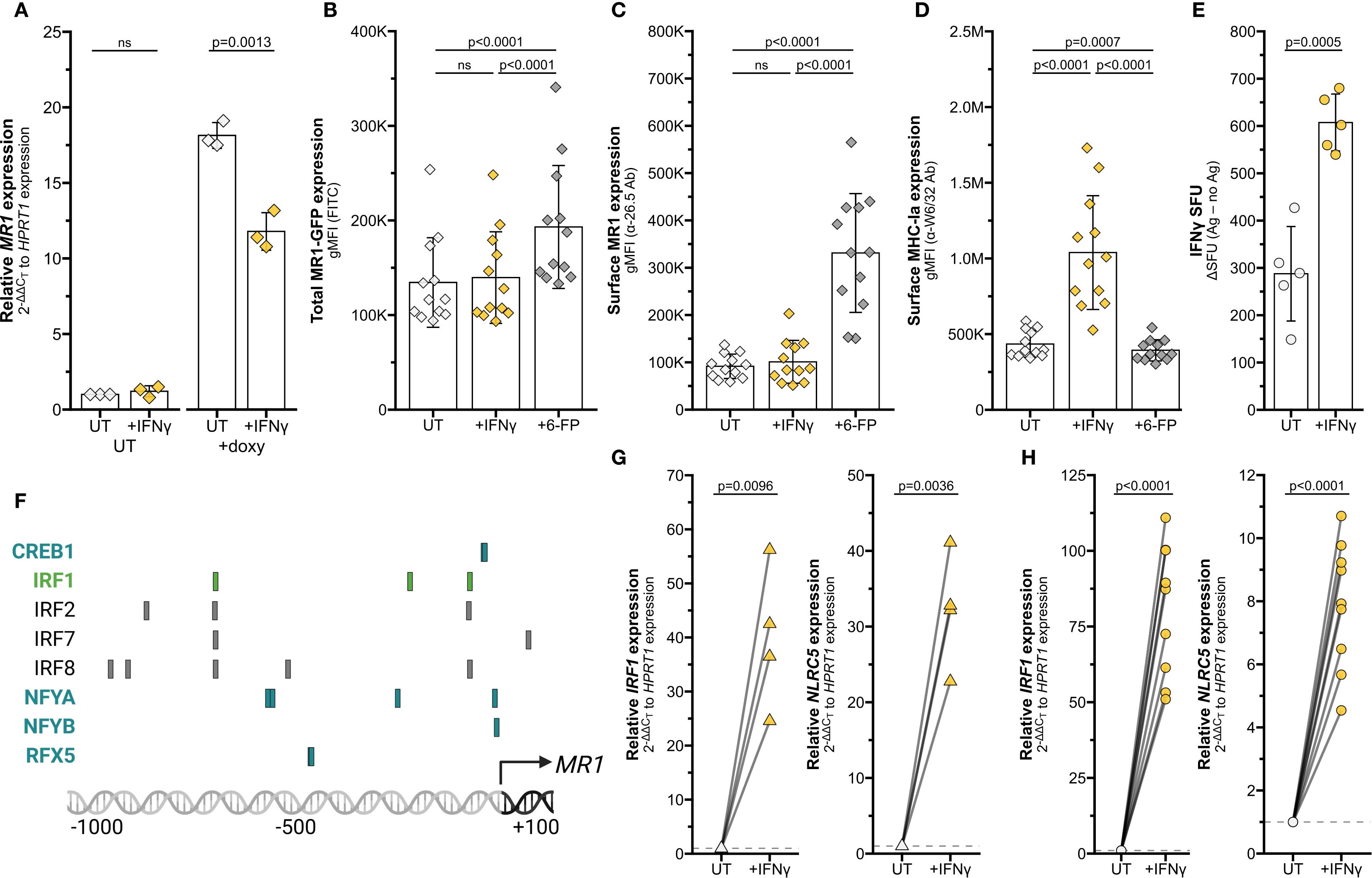 Figure 3. Transcriptional stimulation of MR1 by IFNγ. (A–D) BEAS-2B:doxMR1-GFP cells were treated with doxycycline, IFNγ, and/or 6-FP overnight. (A) MR1 expression was calculated relative to HPRT1 expression and UT control, paired by experimental replicate. gMFI of (B) MR1-GFP, (C) surface MR1 α-26.5 stain, and (D) surface MHC-Ia α-W6/32 stain. Data are experimental replicates. (E) ELISPOT of BEAS-2B cells treated with filtered M. smegmatis supernatant and MAIT cells. Data points are experimental replicates of no-antigen background-subtracted IFNγ spot-forming units (SFU). Subtracting the background SFU (average 15.6 SFU for UT and 33.7 SFU for IFNγ-treated cells) did not impact statistical significance. (F) Putative transcription factor binding sites were acquired through the Eukaryotic Promoter Database browser using the Search Motif Tool to perform on-the-fly scanning for transcription factor motifs using the FindM tool from the Signal Search Analysis (SSA) Server toolkit (28, 102–104). Highlighted proteins are involved in IRF1- (green) or NLRC5 enhanceosome- (blue) mediated HLA transcription. RT-qPCR of (G) primary human AECs or (H) BEAS-2B cells treated with recombinant IFNγ for 12 hours. IRF1 (left) and NLRC5 (right) expression were calculated relative to HPRT1 expression and UT control, paired by individual donor or experimental replicate. Pairwise T tests were performed by experiment (A–E, H) or donor (G). Diamonds represent data from BEAS-2B:doxMR1-GFP cells, triangles represent data from primary AEC, and circles represent data from BEAS-2B cells. Yellow symbols indicate IFNγ treatment.