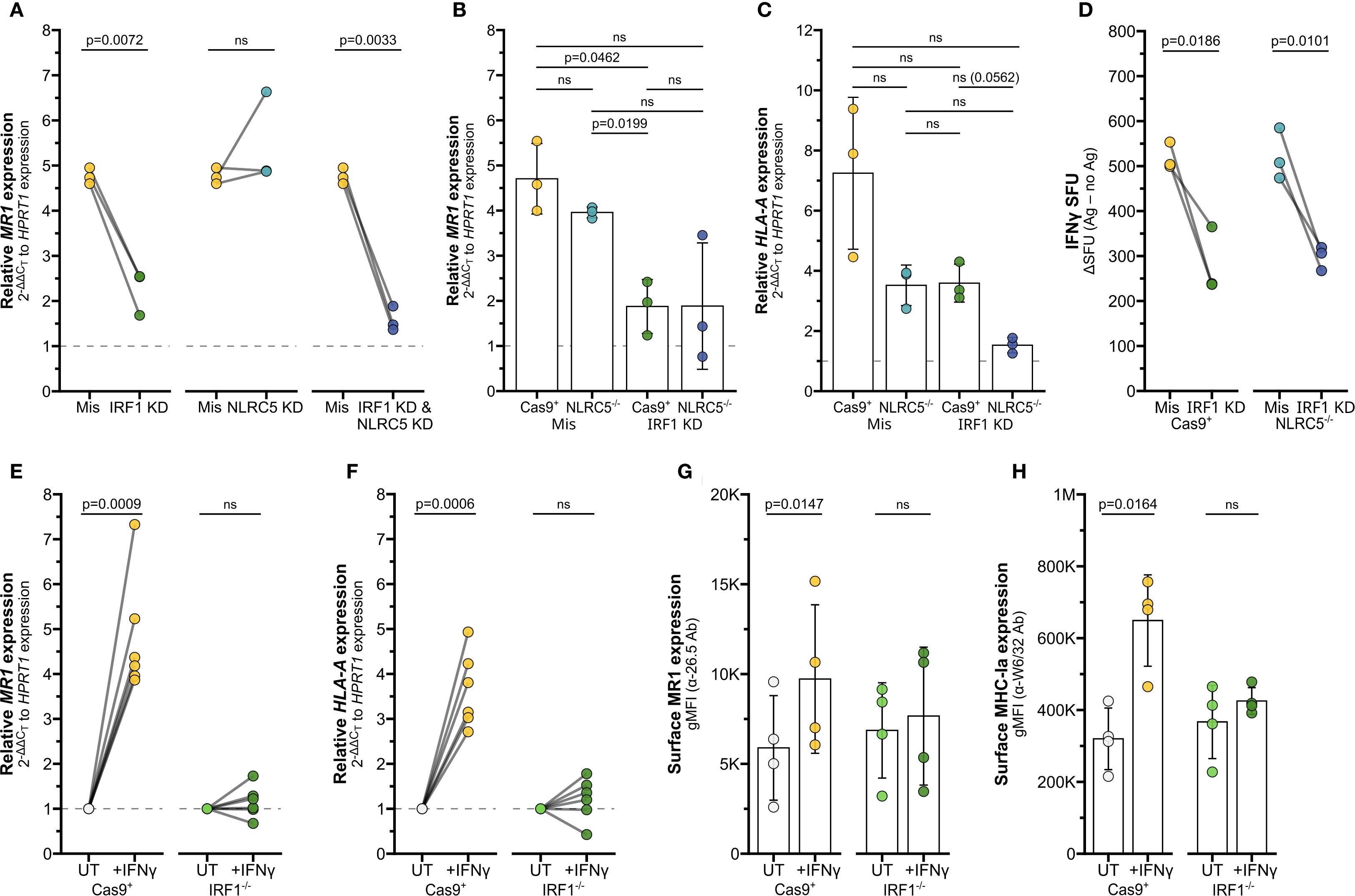 Figure 4. IRF1 mediates IFNγ-induced MR1 transcription. (A) RT-qPCR of BEAS-2B cells treated with IRF1, NLRC5, and/or missense siRNA as labeled for 36 hours, then incubated with IFNγ for 12 hours. MR1 expression was calculated relative to HPRT1 expression and missense UT control, paired by experimental replicate. (B, C) RT-qPCR of Cas9+ or NLRC5-/- clone #1 BEAS-2B cells treated with IRF1 or missense siRNA for 36 hours, then incubated with IFNγ for 12 hours. (B) MR1 and (C) HLA-A expression were calculated relative to HPRT1 expression and Cas9+ or NLRC5-/- clone #1 missense UT controls, paired by experimental replicate. (D) Cells in (B, C) were used as antigen-presenting cells in ELISPOT assay, with filtered M. smegmatis supernatant as the antigen source. Data points are experimental replicates of Cas9+ or NLRC5-/- clone #1 missense control no-antigen background-subtracted IFNγ SFU. Subtracting the background SFU (averages: Cas9+ missense 31.3 SFU, Cas9+ IRF1 KD 18.3 SFU, NLRC5-/- missense 22.0 SFU, NLRC5-/- IRF1 KD 13.9 SFU) did not impact statistical significance. (E, F) RT-qPCR of Cas9+ or IRF1-/- clone #2 BEAS-2B cells treated with IFNγ for 12 hours. (E) MR1 and (F) HLA-A expression were calculated relative to HPRT1 expression and Cas9+ or IRF1-/- clone #2 UT controls, paired by experimental replicate. (G, H) Flow cytometry of Cas9+ or IRF1-/- clone #1 BEAS-2B cells treated with IFNγ for 12 hours. gMFI of (G) surface MR1 (α-26.5 Ab) and (H) MHC-Ia (α-W6/32 Ab) are paired by experimental replicate. Statistical analyses are in Supplementary Table 2. Yellow symbols indicate IFNγ treatment alone. For visual clarity, silencing of IRF1 (green), NLRC5 (teal), or both (dark blue) are also indicated. In (E-H), light green distinguishes media control IRF1-/- cells from IFNγ-treated IRF1-/- cells (dark green). The symbol 'ns' refers to comparisons with p-values < 0.05.