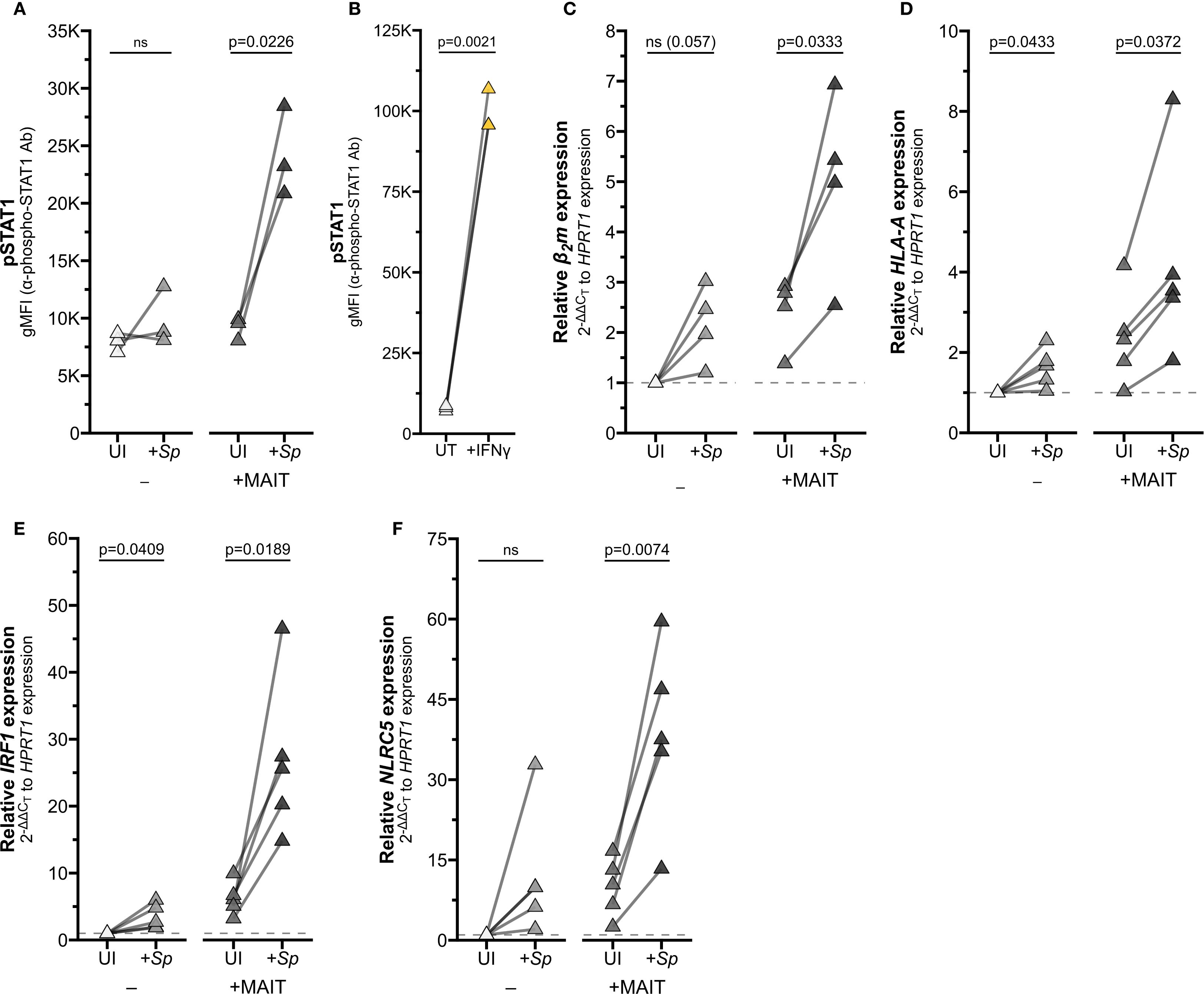 Figure 5. Reciprocal IFNγ signaling in Sp-infected AEC co-cultured with MAIT cells. (A, B) Flow cytometry of (A) primary human AECs infected with S. pneumoniae (Sp) for one hour and incubated overnight with MAIT cell clone (n=3), or (B) AECs treated with IFNγ for 12 hours (n=3). gMFI of stained pSTAT1 expression is paired by individual donor. (C–F) RT-qPCR of primary human AECs infected with S. pneumoniae (Sp) for one hour and incubated overnight with MAIT cell clone. Expression of (C) β2m, (D) HLA-A (E) IRF1, and (F) NLRC5 were calculated relative to HPRT1 expression and UI- control, paired by individual donor (n=4 (C) or n=5 (D–F) donors). Pairwise statistical analyses are in Supplementary Table 3. Yellow symbols indicate IFNγ treatment. The symbol 'ns' refers to comparisons with p-values < 0.05.