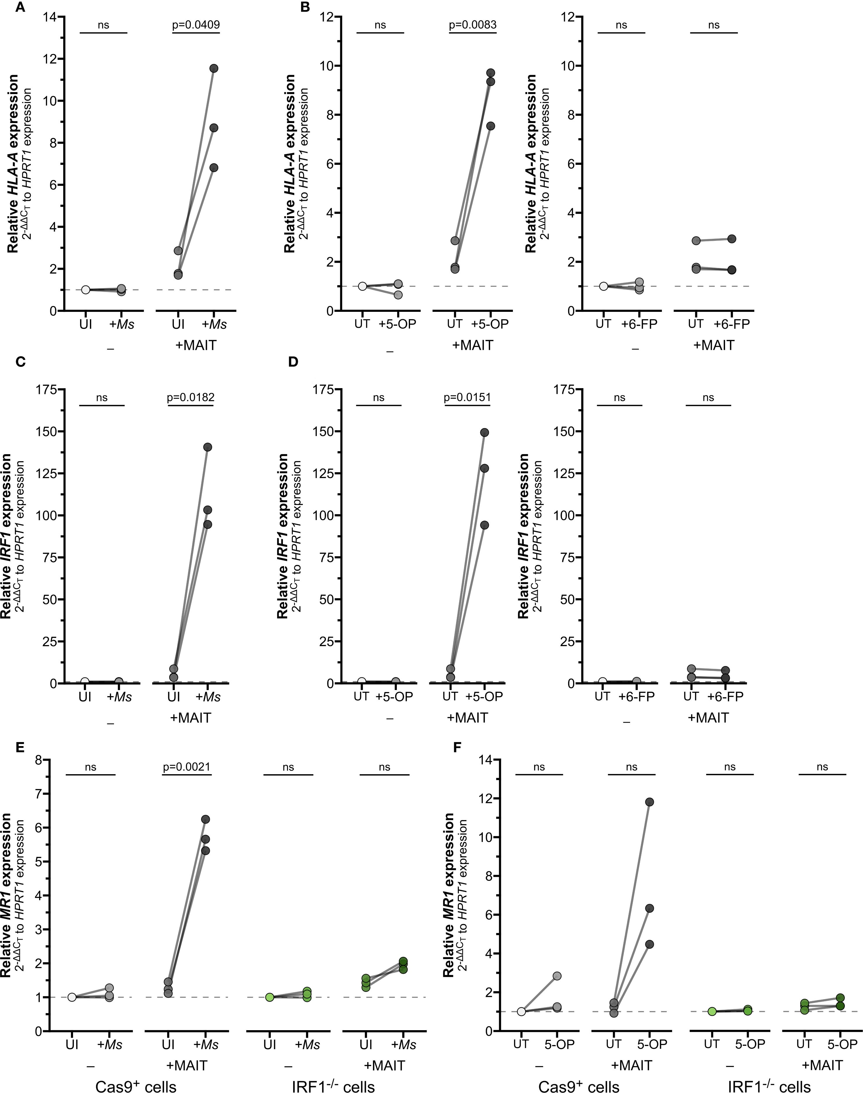 Figure 6. IFNγ produced by activated MAIT cells drives IRF1-dependent MR1 transcription. (A–D) RT-qPCR of wildtype BEAS-2B cells treated as indicated below. Gene expression was calculated relative to HPRT1 expression and UI- or UT- controls, paired by experiment. (A) HLA-A and (C) IRF1 expression of BEAS-2B cells infected with M. smegmatis (Ms) for one hour and incubated overnight with MAIT cell clone. (B) HLA-A and (D) IRF1 expression of BEAS-2B cells treated with 5-OP-RU (left, “5-OP”) or 6-FP (right) for one hour and incubated overnight with MAIT cell clone. (E, F) RT-qPCR of Cas9+ or IRF1-/- clone #1 BEAS-2B cells (E) infected with M. smegmatis or (F) treated with 5-OP-RU for one hour, then incubated overnight with MAIT cell clone. MR1 expression was calculated relative to HPRT1 expression and Cas9+ or IRF1-/- UT- controls, paired by experimental replicate. Pairwise statistical analyses are in Supplementary Table 4. In (E, F), green symbols distinguish IRF1-/- cells from Cas9+ cells (gray) as labeled. The symbol 'ns' refers to comparisons with p-values < 0.05.