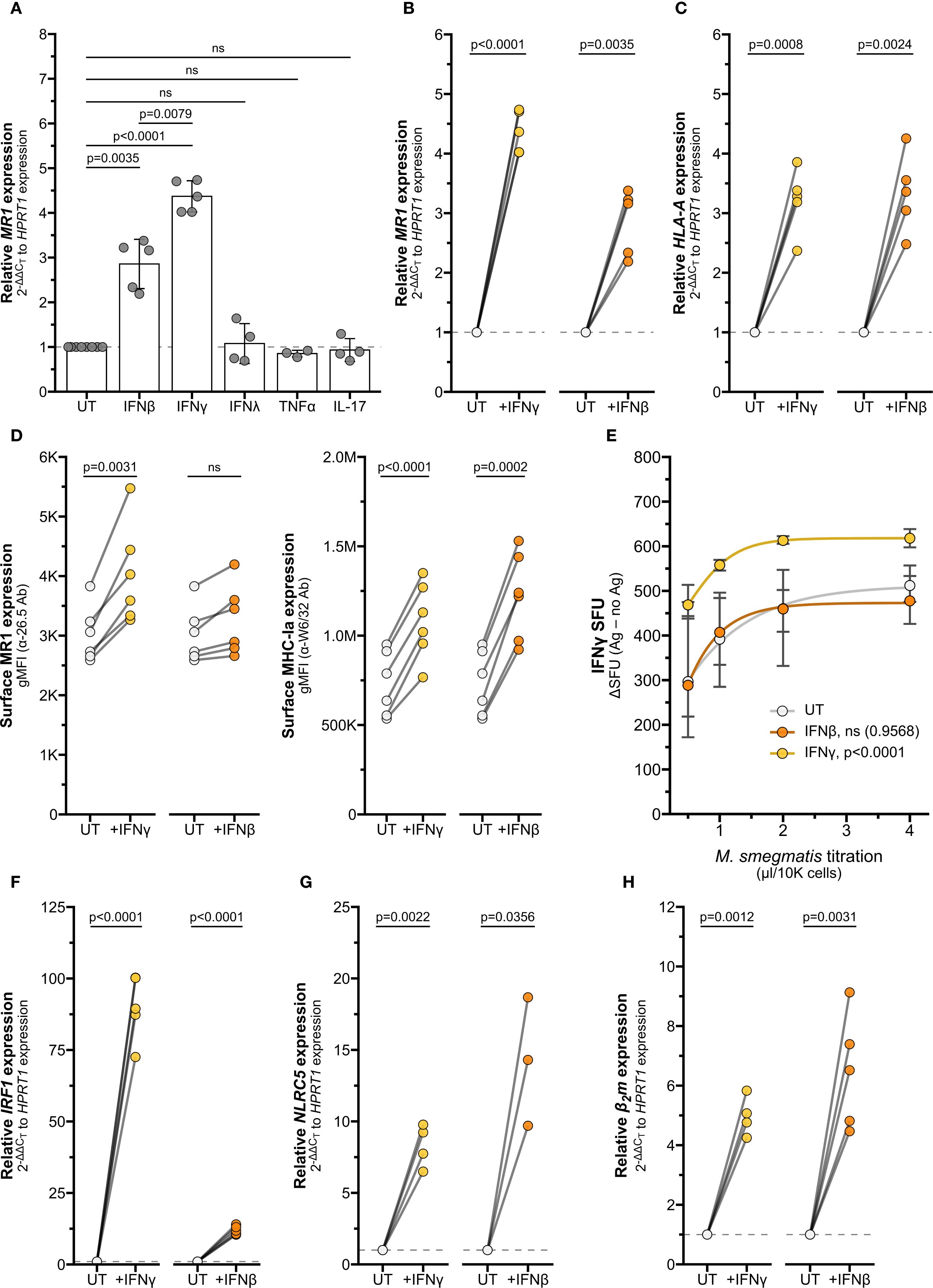Figure 7. Interferons stimulate MR1 and MHC-Ia transcription through different pathways. (A) RT-qPCR of wildtype BEAS-2B cells treated with recombinant human cytokines for 12 hours. MR1 expression was calculated relative to HPRT1 expression and UT controls. (B, C, F–H) RT-qPCR of BEAS-2B cells treated with IFNγ or IFNβ for 12 hours. Expression of (B) MR1, (C) HLA-A (F) IRF1, (G) NLRC5, and (H) β2m were calculated relative to HPRT1 and UT control, paired by experiment. (D) Flow cytometry of BEAS-2B cells treated with IFNγ or IFNβ for 12 hours. gMFI of surface MR1 (left, α-26.5 Ab) and MHC-Ia (right, α-W6/32 Ab) are paired by experimental replicate. (E) ELISPOT of BEAS-2B cells treated with IFNγ or IFNβ for 12 hours, infected with a titration of M. smegmatis for one hour, then incubated with MAIT cells overnight. Data points are average SFU of no-antigen background-subtracted IFNγ SFU. Nonlinear regression agonist response curves were computed in GraphPad Prism 10.4.0 and analyzed with extra sum-of-squares F test to compare with UT control. Statistical analyses are in Supplementary Table 5. Yellow symbols indicate IFNγ treatment, orange symbols indicate IFNβ treatment, and white symbols indicate UT controls. The symbol 'ns' refers to comparisons with p-values < 0.05.