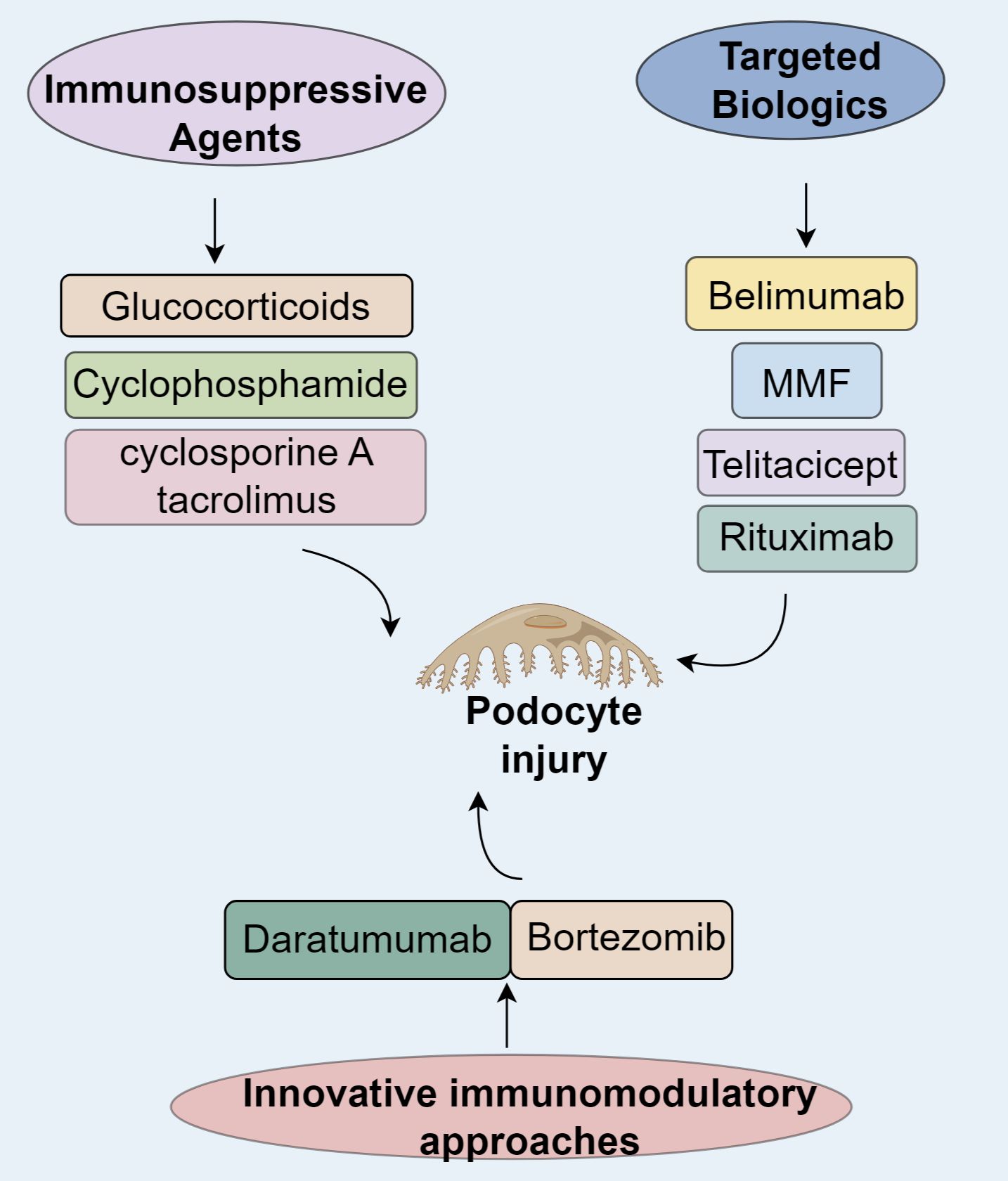 LN is driven by a multifaceted network of autoimmunity in which podocytes are not merely passive victims but active contributors to renal inflammation and immune dysregulation. As the field progresses, a paradigm shift is emerging that positions podocytes as both biomarkers and therapeutic targets. Advances in our understanding of podocyte-specific signaling, such as VEGF Notch, iNOS autophagy, and cytokine-mediated injury, have catalyzed the development of more refined, histotype-specific interventions. The rise of targeted biologics, including belimumab and telitacicept, marks a turning point in LN management with promising efficacy in modulating B cell and plasma cell function. Novel immunomodulators like bortezomib and daratumumab further expand treatment options, particularly in refractory LN characterized by persistent autoantibody production. These agents also hold the potential to indirectly preserve or restore podocyte function by reducing the burden of circulating immune complexes and complement activation.