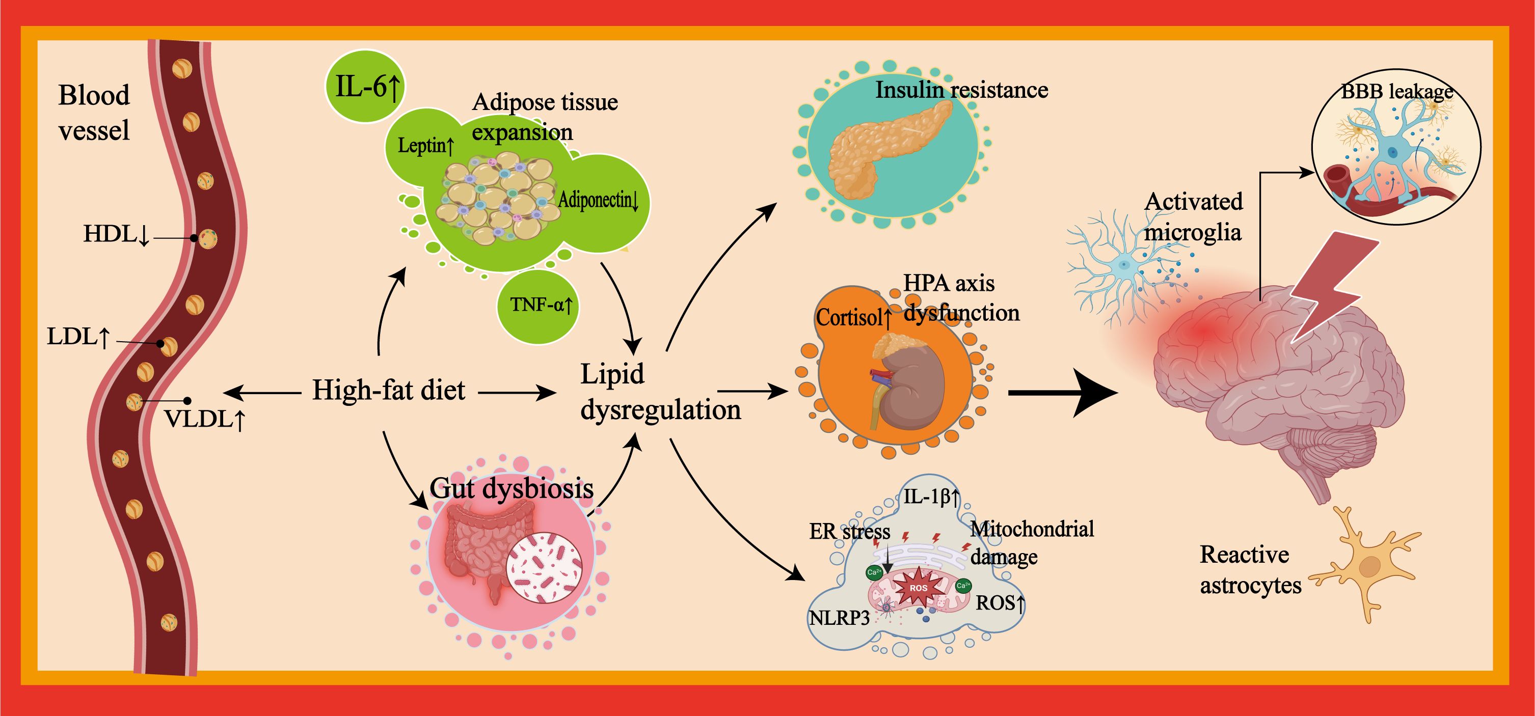 Figure 1. Pathological mechanisms linking lipid dysregulation to neuroinflammation in depression. This figure outlines mechanisms linking lipid dysregulation to neuroinflammation and depression. Depression patients frequently exhibit unhealthy lifestyle habits. Excessive consumption of high-fat foods can induce lipid dysregulation. Their peripheral blood is often characterized by a metabolic imbalance featuring elevated LDL and VLDL levels and reduced HDL levels. Visceral adipose tissue expansion induced by unhealthy dietary patterns is particularly susceptible to immune cell infiltration and cytokine secretion (e.g., IL-6, TNF-α). Furthermore, aided by concomitant gut microbiota dysbiosis resulting from such patterns, a chronic systemic inflammatory state develops. This state promotes and/or accompanies metabolic and endocrine risks (e.g., insulin resistance, HPA axis dysregulation (excessive cortisol secretion), and adipokine dysregulation) and impairment of organelle function (e.g., mitochondrial damage and ER stress). Collectively, these factors exacerbate lipid dysregulation and sustain peripheral inflammation. Persistent peripheral inflammation can lead to compromised BBB integrity, promote neuroinflammation, and induce alterations in neuroplasticity within mood-regulating neural networks, which may ultimately contribute to depressive symptoms. LDL, low-density lipoprotein; VLDL, very low-density lipoprotein; HDL, high-density lipoprotein; IL-6, interleukin-6; TNF-α, tumor necrosis factor-alpha; HPA, hypothalamic-pituitary-adrenal; ER, endoplasmic reticulum; BBB, blood-brain barrier.