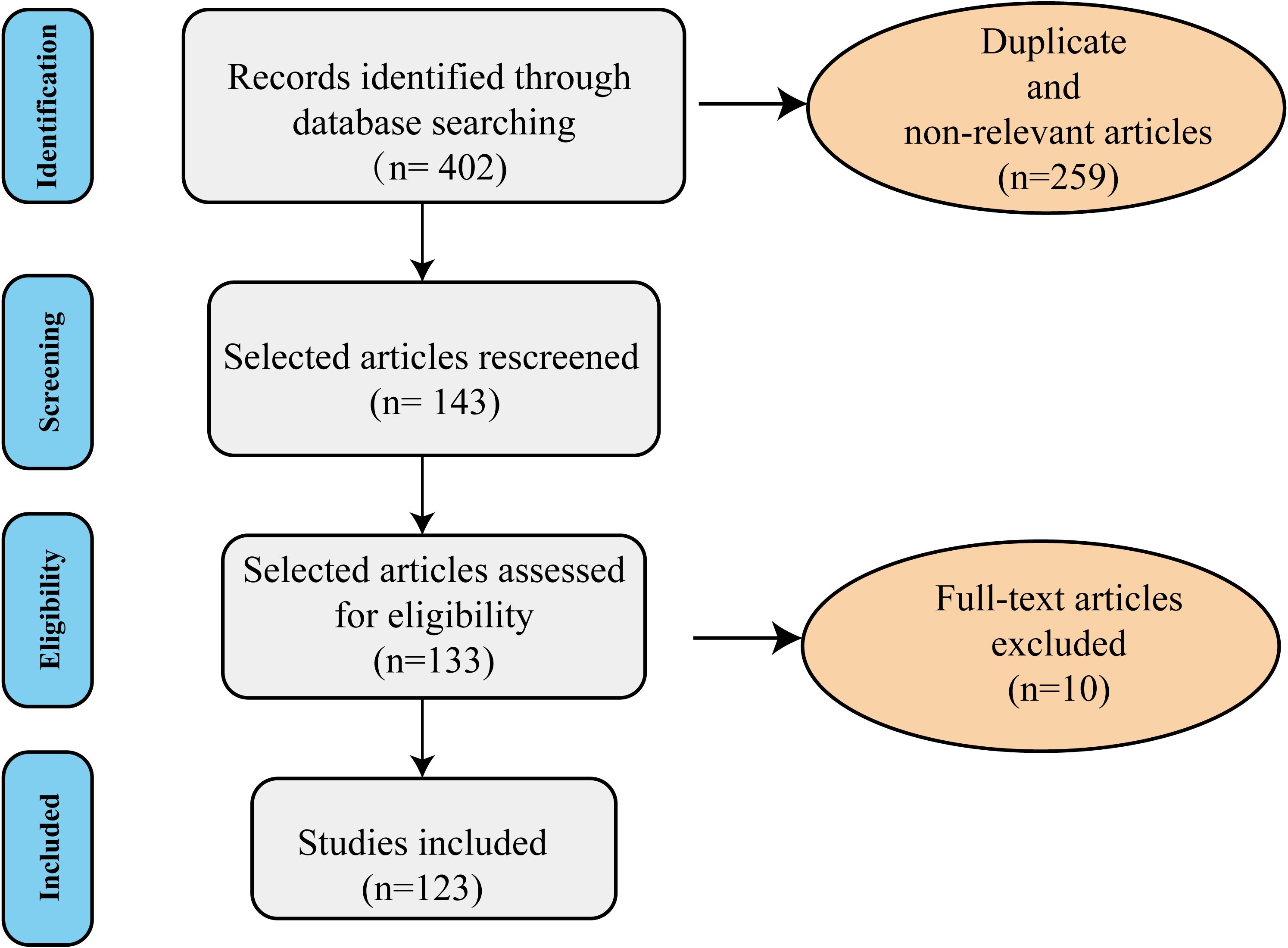 Figure 2. The diagram of the search strategy. The flow chart of review shows the included and excluded studies (duplicated, review articles, non-relevant, and those in non-English language). A total of 123 studies were included in the current literature.