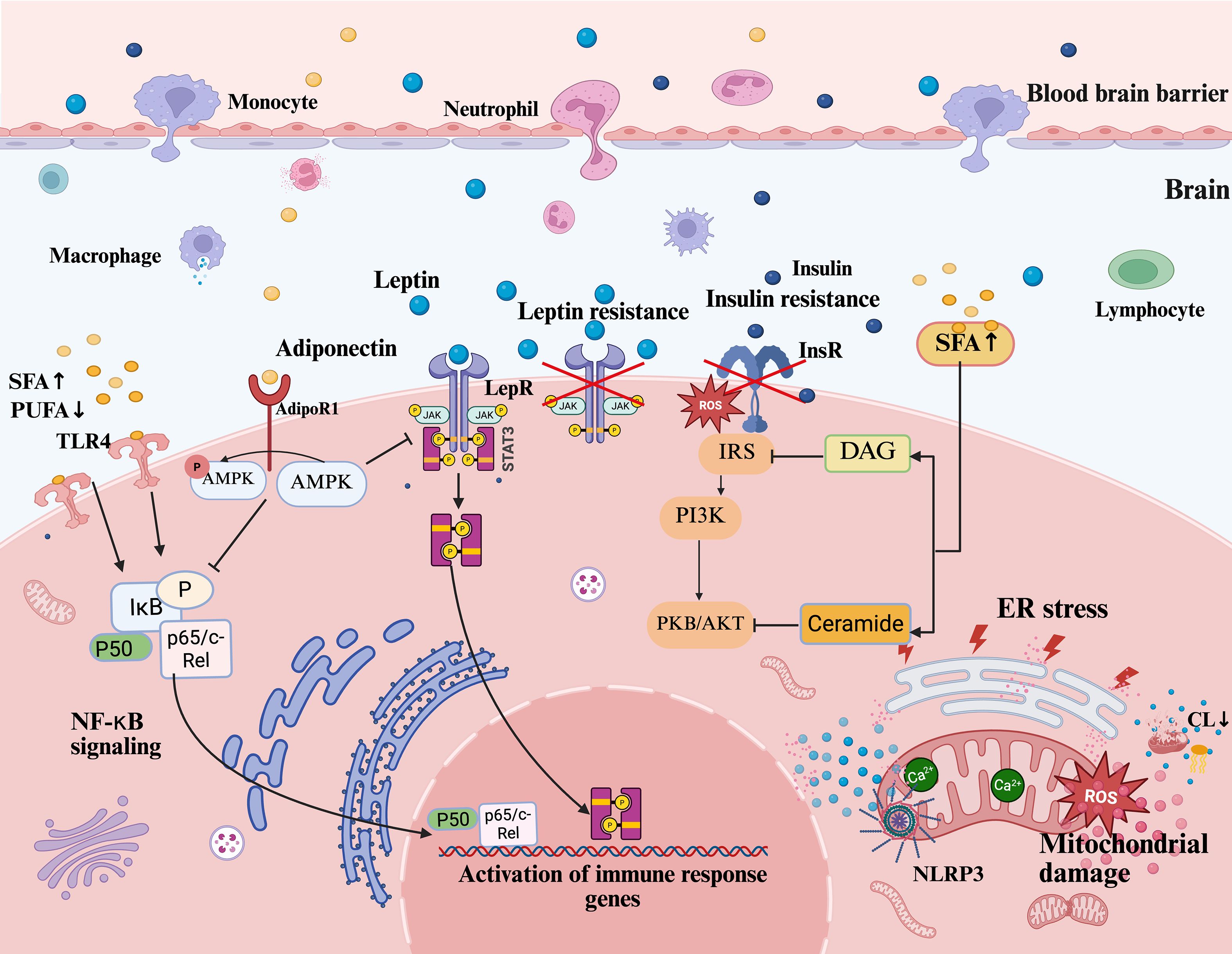 Leptin stimulates monocyte proliferation, differentiation, and induces pro-inflammatory cytokine production (140, 141). Leptin-deficient mouse model exhibits lymphoid atrophy, immune cell loss, and reduced inflammation (140). Leptin receptor (LepR) is widely expressed on the surface of various types of immune cells, and when leptin binds to the receptor, it activates the Janus kinase 2/signal transducer and activator of transcription 3 (JAK2/STAT3) signaling pathway and promotes the expression of inflammatory factors by inducing homodimerization of LepR (142). Notably, while leptin upregulates the secretion of inflammatory factors such as TNF-α, IL-6, and IL-12, these inflammatory factors in turn can feed back to promote leptin mRNA expression in adipose tissue, forming a pro-inflammatory positive feedback loop (143). Leptin also crosses the BBB, promoting CNS IL-1β release from monocytes and inducing neuroinflammation (144), suggesting that it has a key role in chronic inflammation associated with lipid dysregulation. The hypothalamus, a key target of leptin action, is rich in LepR in the arcuate nucleus. Normally, elevated postprandial serum leptin levels promote pro-opiomelanocortin-expressing neurons (POMC neurons) activation through the JAK2-STAT3 pathway, which suppresses food intake and helps regulate body weight. However, hypothalamic leptin resistance causes dysfunction in this pathway, leading to increased obesity and lipid dysregulation (145).