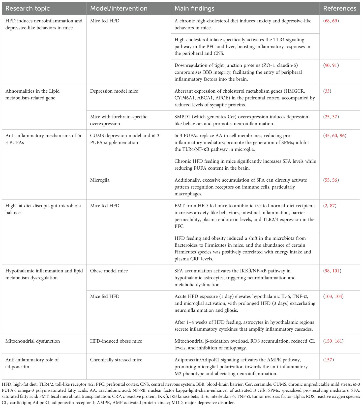 Peripheral inflammation induces neuroinflammation by compromising BBB integrity (88). Elevated peripheral inflammatory mediators and lipid dysregulation destabilize the BBB, increasing its permeability. A key mechanism involves disrupted expression of tight junction proteins (e.g., zonula occludens-1 [ZO-1], claudin-5, and occludin) (89). Experimental evidence shows that 8 weeks of HFD feeding in mice significantly reduces ZO-1, claudin-5, and occludin protein levels, causing cerebral microvascular leakage (90). Prolonged HFD exposure (13 weeks) further downregulates tight junction protein mRNA (notably claudin-5 and claudin-12) in the choroid plexus and BBB (91). Circulating cytokines crossing the permeable BBB disrupt depression-associated brain signaling (11, 92), suggesting that lipid dysregulation-induced BBB dysfunction facilitates aberrant peripheral-CNS communication, contributing to inflammation-driven depressive behaviors. Peripherally activated microglia suppress neural stem cell proliferation, enhance neural progenitor cell apoptosis, and impair neurogenesis by reducing newborn neuron survival and synaptic integration (93). Moreover, monocytes, macrophages, and T cells infiltrate the CNS, amplifying neuroinflammation via cytokine secretion.