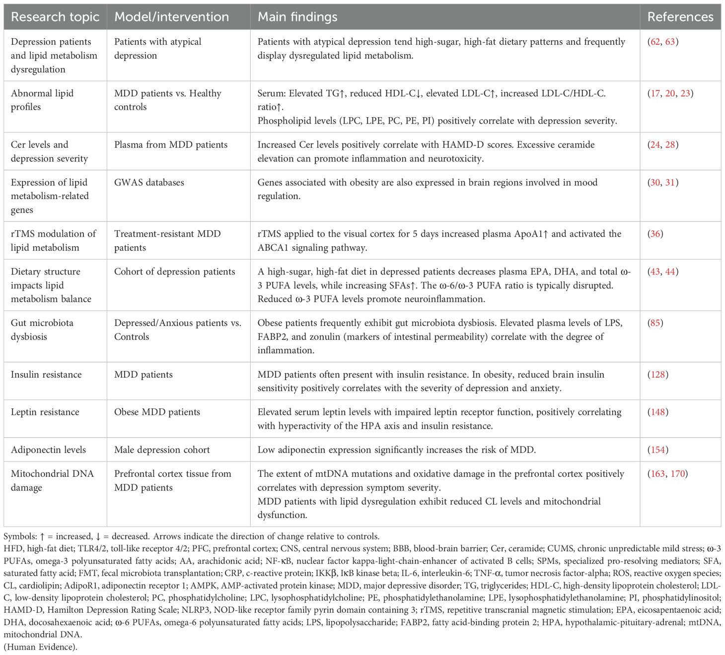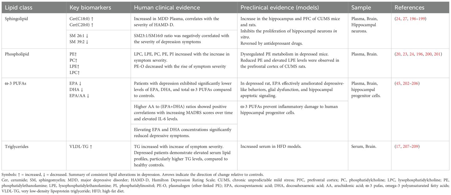 (3) Sphingolipid Metabolism Abnormalities: Plasma ceramide (Cer) levels are also significantly increased in depressed patients compared to healthy controls and correlate with the severity of the Hamilton Depression Rating Scale (HAMD-D) (24). Under depressive conditions, oxidative stress activates acid sphingomyelinase (ASM), leading to the catabolism of sphingolipids into Cer (25). Increased ASM and Cer levels inhibit the effects of antidepressant medications (26, 27). Excessive Cer accumulation not only activates the NOD-like receptor family pyrin domain containing 3 (NLRP3) inflammasome, triggering the release of numerous inflammatory factors (28), but also forms pro-apoptotic channels in the mitochondrial membrane. This damages the electron transport chain, leading to increased reactive oxygen species (ROS) and decreased ATP production (29). These changes are both pro-inflammatory and neurotoxic, thereby exacerbating the pathological progression of depression Table 3 compares the lipid dysregulation profiles between depression patients and preclinical models..