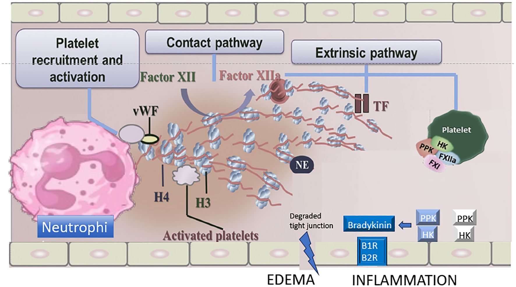 Figure 1. Major drivers involved in inflammation and coagulation activation eventually leading to thromboinflammatory pathways in Bothrops sp. envenoming. Proposed mechanisms of contact phase activation with NET formation, extrinsic coagulation, von Willebrand factor (vWF) and kallikrein/bradykinin pathway following Bothrops sp. venom exposure. H, histone; NE, neutrophil elastase; TF, tissue factor; HK, high-molecular-weight kininogen; PPK, plasma prekallikrein; B1R/B2R, bradykinin 1/2 receptors. Adapted from Teixeira C et al. Inflammation Induced by Platelet-Activating Viperid Snake Venoms: Perspectives on Thromboinflammation. Front Immunol. 2019;10:2082. doi:10.3389/fimmu.2019.02082.