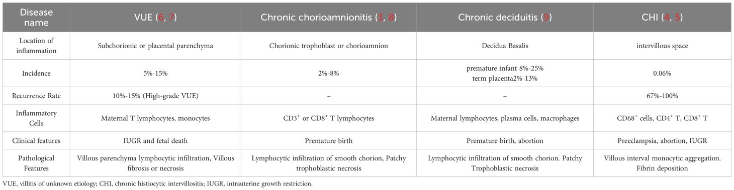 Chronic histiocytic villous interstitial inflammation (CHI), also known as chronic villous interstitial inflammation of unknown etiology (CIUE), is a severe inflammatory disease that significantly affects the villous spaces (1–3). CHI distinguishes from chronic villitis, chronic deciduitis, or chronic chorionic amnionitis, although CHI may coexist with chronic villitis in the same inflamed placenta (4–9) (Table 1). CHI patients often exhibit severe adverse pregnancy outcomes and a high recurrence rate, associated with complications such as miscarriage and fetal growth restriction (10). However, the understanding of the pathogenesis, diagnosis, and treatment strategies for CHI remains in its infancy.
