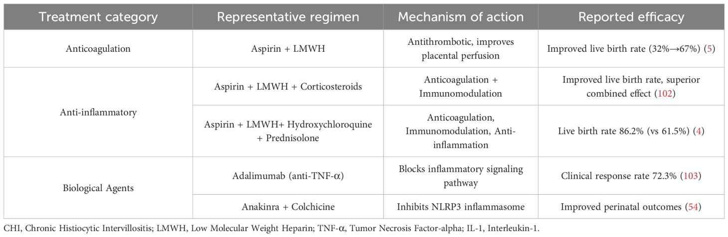 Regarding anticoagulant therapy, research findings remain inconsistent (Table 2). A French clinical study involving 21 CHI patients showed that while the use of aspirin and low-molecular-weight heparin (LMWH) alone did not reduce the risk of preterm birth (still at 30%), the live birth rate significantly increased from 32% to 67% (12). In 2017, Japanese scholars proposed a triple therapy combining low-dose aspirin, corticosteroids, and LMWH. This strategy further improved the live birth rate and demonstrated superior clinical benefits compared to single anticoagulant regimens (107). A UK study involving 28 patients with refractory CHI demonstrated that adding hydroxychloroquine (200 mg/day) and prednisolone (20 mg/day) to aspirin (75–150 mg/day) and LMWH therapy significantly improved the live birth rate (from 61.5% to 86.2%, p < 0.05) (11). However, due to the small sample sizes of all studies and the lack of randomized controlled trials, the exact efficacy and applicability of combined anticoagulation and immunosuppression therapy in a broader population remain controversial.
