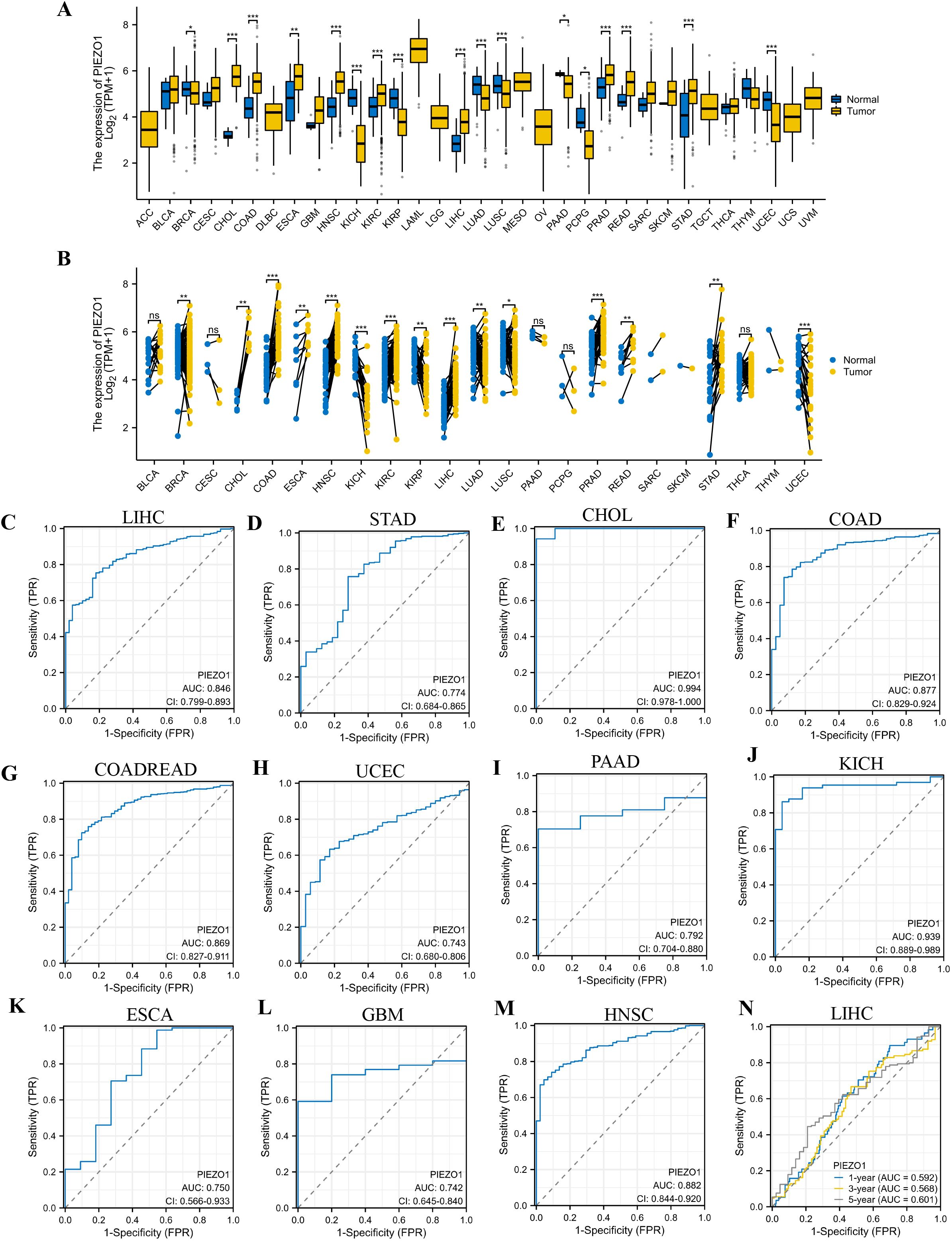 Figure 1. Expression level and diagnostic value of PIEZO1. (A, B) PIEZO1 mRNA expression in unpaired and paired cancerous and normal tissues based on the TCGA database. (ns: no significance; *p < 0.05; **p < 0.01; ***p < 0.001). (C–M) The diagnostic value of PIEZO1 was determined using ROC curves. (N) The predictive efficiency of PIEZO1 was determined using time-dependent ROC curves.