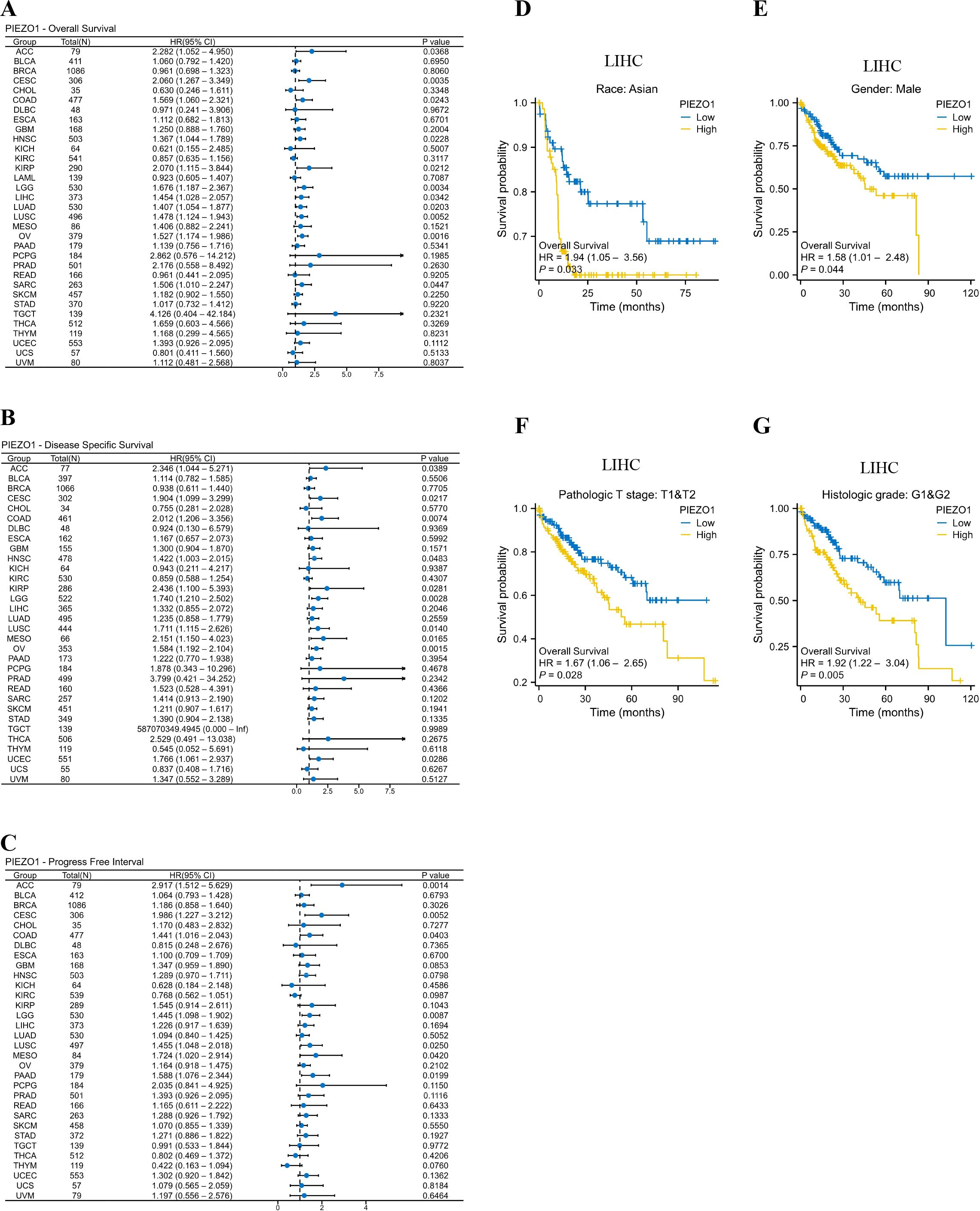 Interestingly, in the LIHC subgroup, patients with Asian, Males, pathologic T stages T1 and T2, and Histologic grades G1 and G2, high PIEZO1 expression correlated with poorer OS compared to low expression (Figures 2D–G).