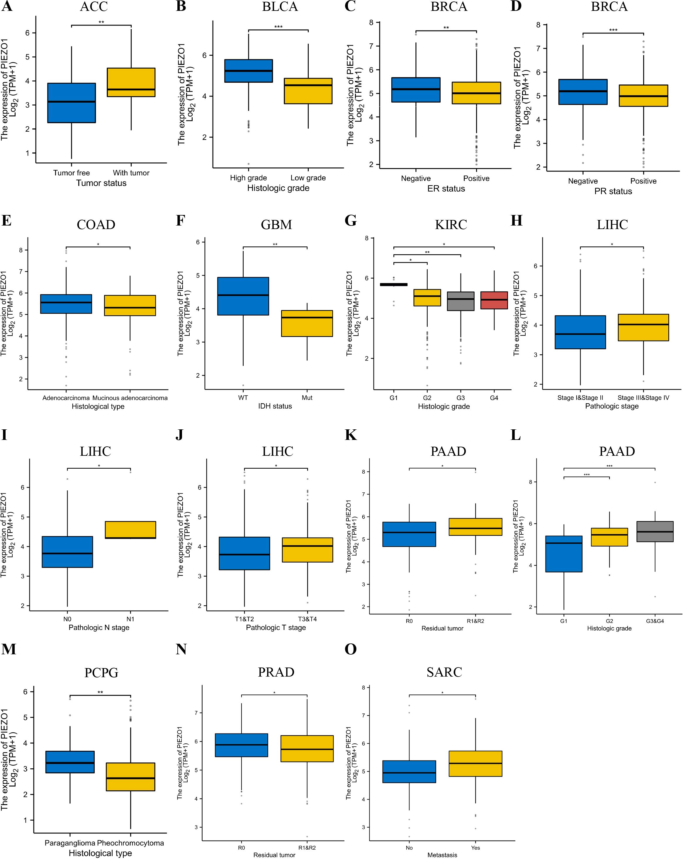 Figure 3. Relationship between PIEZO1 and clinical features. (A) The relationship between PIEZO1 and tumor status in ACC. (B) The relationship between PIEZO1 and histologic grade in BLCA. (C) The relationship between PIEZO1 and ER statuses in BRCA. (D) The relationship between PIEZO1 and PR statuses in BRCA. (E) The relationship between PIEZO1 and histological type in COAD. (F) The relationship between PIEZO1 and IDH status in GBM. (G) The relationship between PIEZO1 and histologic grade in KIRC. (H) The relationship between PIEZO1 and the pathologic stage in LIHC. (I) The relationship between PIEZO1 and pathological N stage in LIHC. (J) The relationship between PIEZO1 and pathologic T stage in LIHC. (K) The relationship between PIEZO1 and residual tumor in PAAD. (L) The relationship between PIEZO1 and histologic grade in PAAD. (M) The relationship between PIEZO1 and histological type in PCPG. (N) The relationship between PIEZO1 and residual tumor in PRAD. (O) The relationship between PIEZO1 and metastasis in SARC. (*p < 0.05; **p < 0.01; ***p < 0.001).