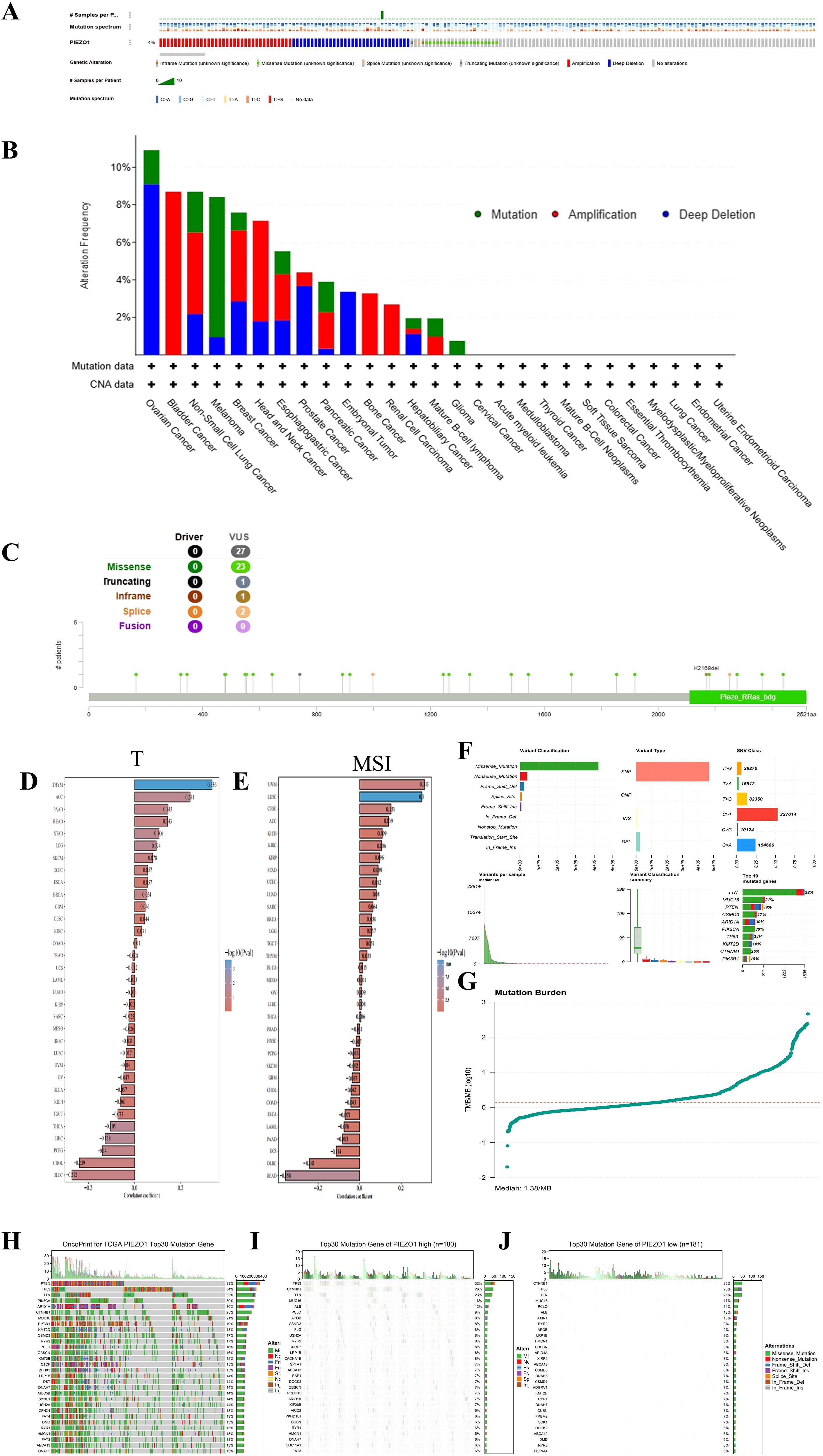 Figure 4. Mutation characteristics of PIEZO1. (A–C) Genetic alteration landscape (A), frequencies (B), and sites (C) of PIEZO1 across pan-cancer based on cBioportal database. (D) The relationship between PIEZO1 and TMB based on the TCGA database. (E) The relationship between PIEZO1 and MSI based on the TCGA database. (F) Analysis of mutation types in HCC. (G) Comparison of TMB in HCC. (H) Top 30 frequently mutated genes in all samples. (I) Top 30 frequently mutated genes in the PIEZO1 high-expression group. (J) Top 30 frequently mutated genes in the PIEZO1 low-expression group.