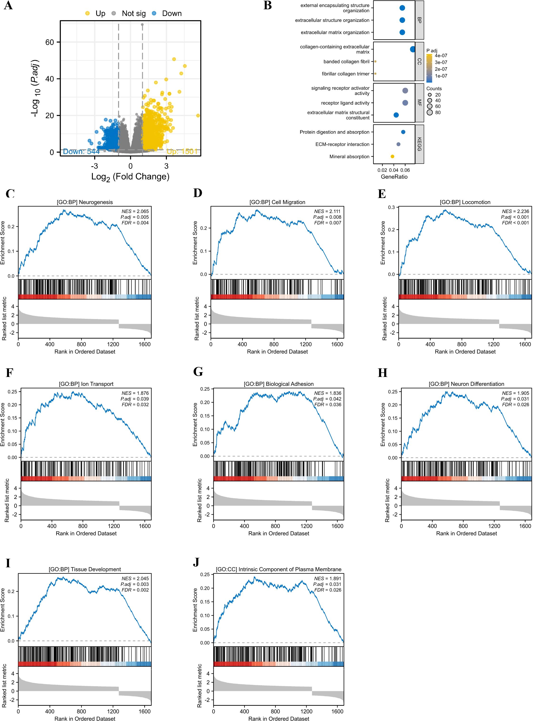The GSEA analysis revealed that elevated PIEZO1 expression was significantly correlated with a range of biological processes and cellular components, including neurogenesis (NES = 2.065, P.adj = 0.005) (Figure 5C), cell migration (NES = 2.111, P.adj = 0.008) (Figure 5D), locomotion (NES = 2.236, P.adj < 0.001) (Figure 5E), lon transport (NES = 1.876, P.adj = 0.039) (Figure 5F), biological adhesion (NES = 1.836, P.adj = 0.042) (Figure 5G), neuron differentiation (NES = 1.905, P.adj = 0.031) (Figure 5H), tissue development (NES = 2.045, P.adj = 0.003) (Figure 5I), and intrinsic component of plasma membrane (NES = 1.891, P.adj = 0.031) (Figure 5J).