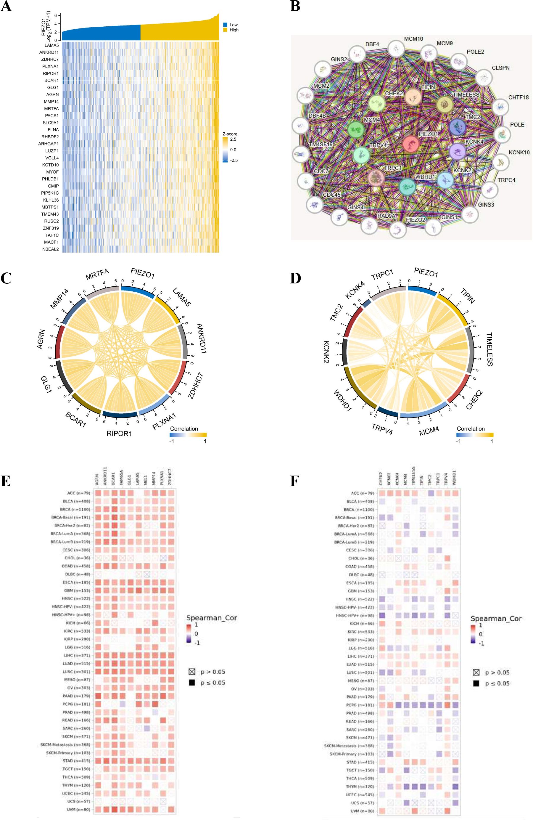 Figure 6. The co-expression partners of PIEZO1. (A) The heat map showed the top 30 genes related to PIEZO1 in LIHC based on the TCGA database. (B) The network diagram showed the top 30 proteins related to PIEZO1 based on the STRING tool. (C, D) The chord diagram showed the correlations between PIEZO1 and the top 10 genes (C) and proteins (D). (E, F) The relationship between PIEZO1 and its co-expressed partners in pan-cancer based on the TIMER2 database.