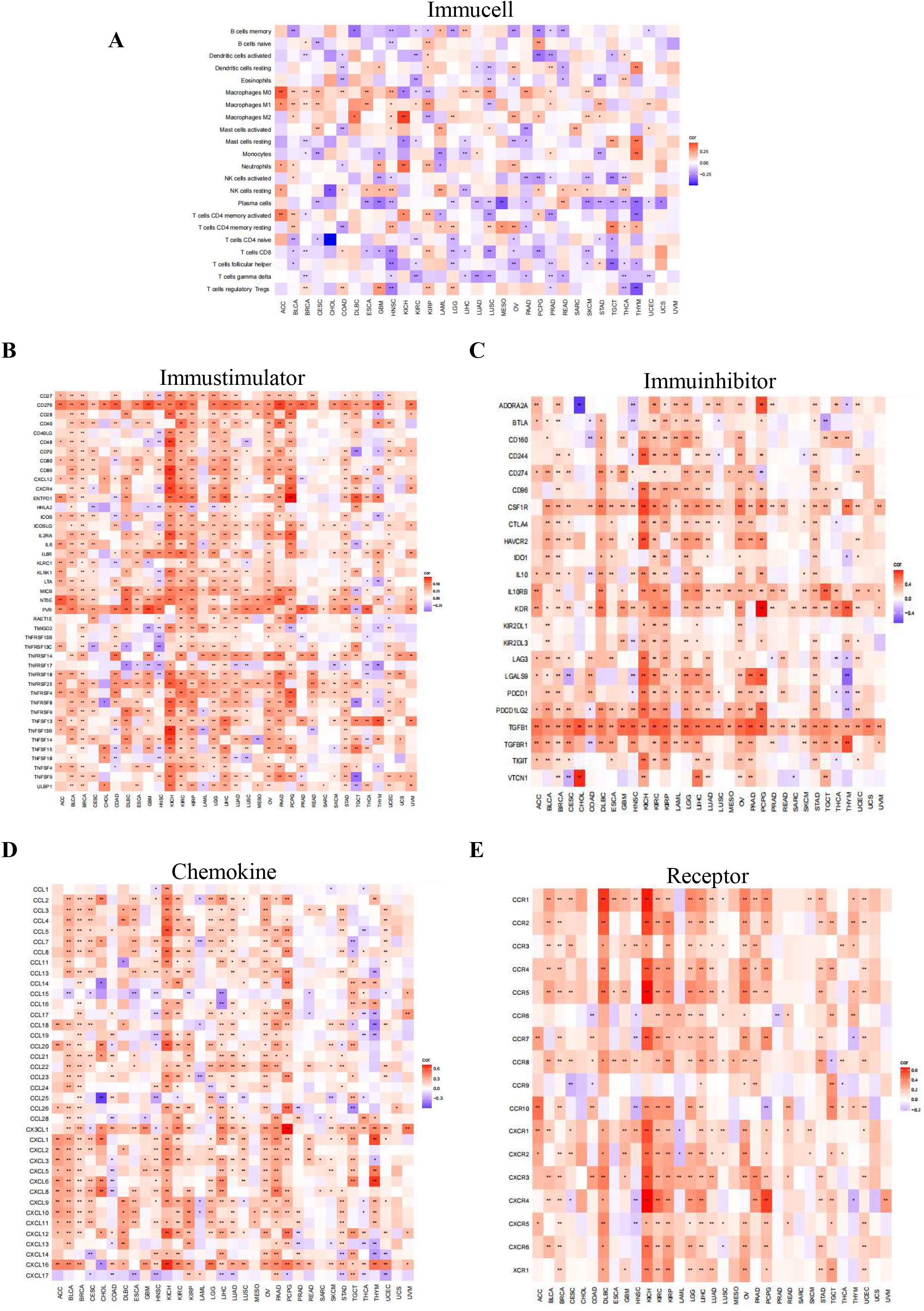 Figure 7. Association of PIEZO1 and TIME. (A–E) The relationship between PIEZO1 and immune cells (A), immunostimulators (B), immune inhibitors (C), chemokines (D), and receptors (E). Red indicates positive correlations, while blue signifies negative ones.