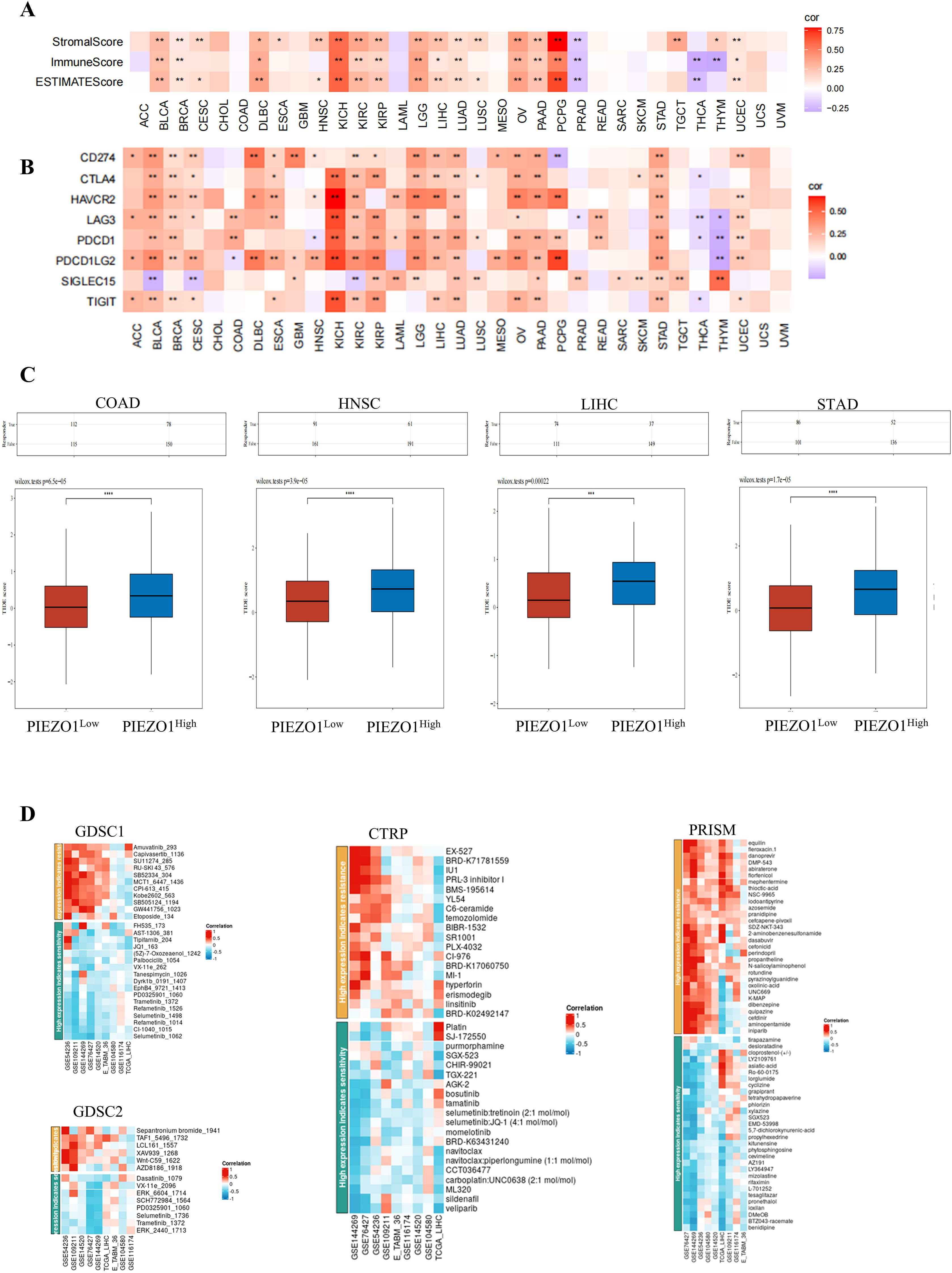 Figure 8. The function of PIEZO1 in cancer immunotherapy and drug response. (A) The association of PIEZO1 with StromalScore, ImmuneScore, and ESTIMATEScore in pan-cancer. (B) The relationships between PIEZO1 and immune checkpoints in pan-cancer. (C) TIDE scores in COCA, HNSC, LIHC, and STAD patients stratified by high or low PIEZO1 expression. (D) The function of PIEZO1 in drug response using the BEST database. *p < 0.05; **p < 0.01; ***p < 0.001; ****p < 0.0001.