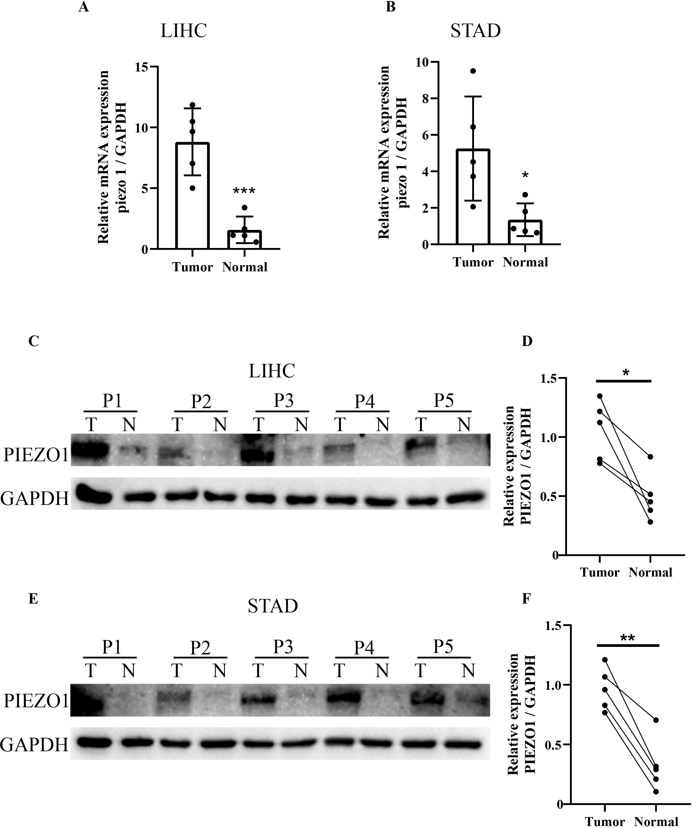 Figure 9. qRT-PCR and WB analysis of PIEZO1 expression in tumor tissues. (A, B) qRT-PCR analysis of PIEZO1 expression in LIHC and STAD tissues. Data are presented as mean ± SD of three technical replicates per sample. (C–F) WB analysis of PIEZO1 expression in LIHC and STAD tissues. *p < 0.05; **p < 0.01; ***p < 0.001.