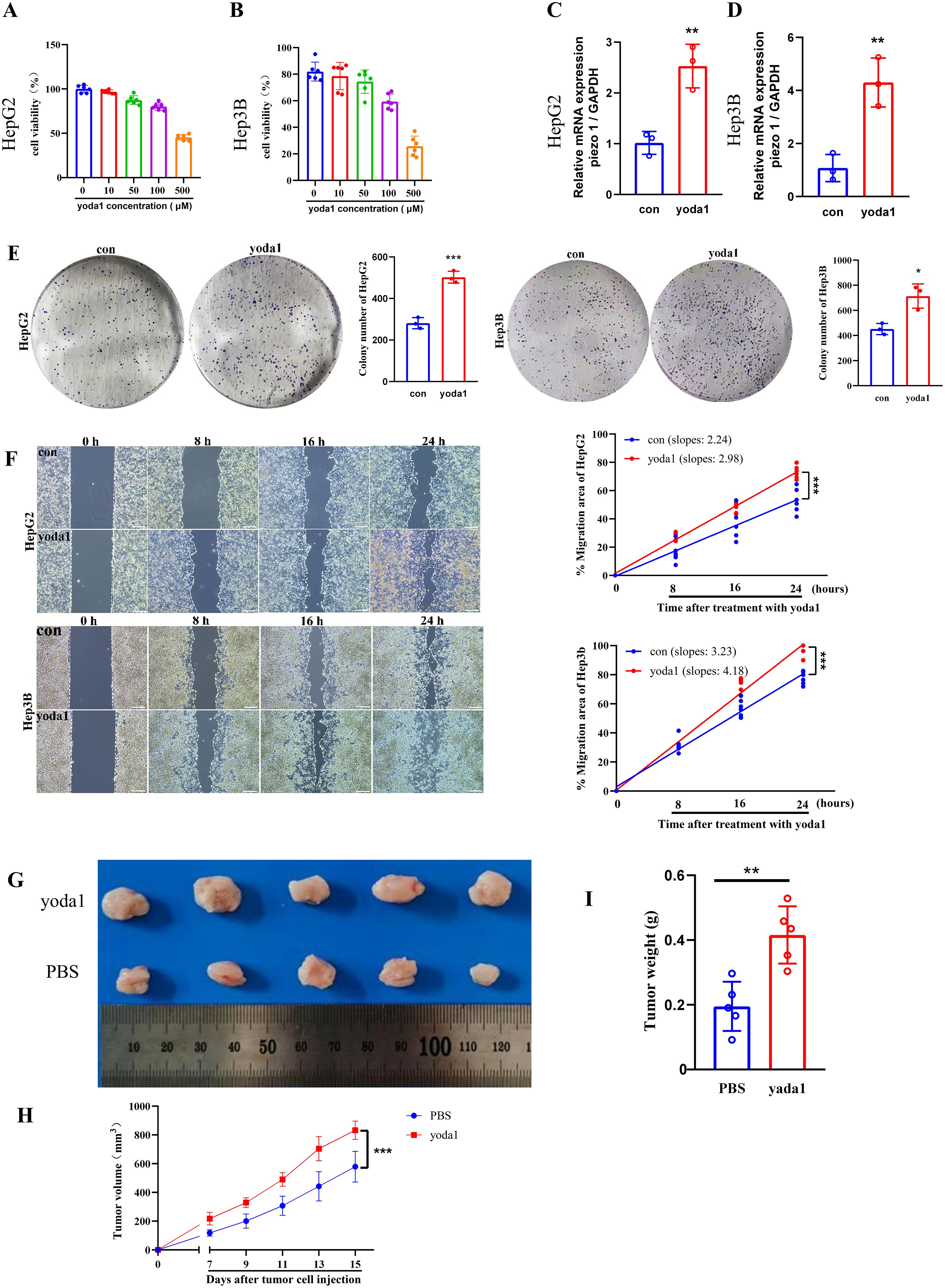 Figure 10. Piezo1 promotes liver cancer cell proliferation and metastasis in vitro and vivo. (A, B) CCK-8 assay results of liver cancer cells exposed to varying yoda1 concentrations. (C, D) qRT-PCR analysis of PIEZO1 expression in liver cancer cells treated with 50 μM yoda1 versus controls. (E) Representative colony formation assay images and statistics for liver cancer cells treated with 50 μM yoda1 or PBS. (F) Representative wound healing assay images and statistics for liver cancer cells treated with 50 μM yoda1 or PBS, scale bar = 50 μm. (G) Xenograft tumor images in yoda1 and control groups. (H, I) The volume and weight of tumors were analyzed in the yoda1 and control groups. (*p < 0.05; **p < 0.01; ***p < 0.001).