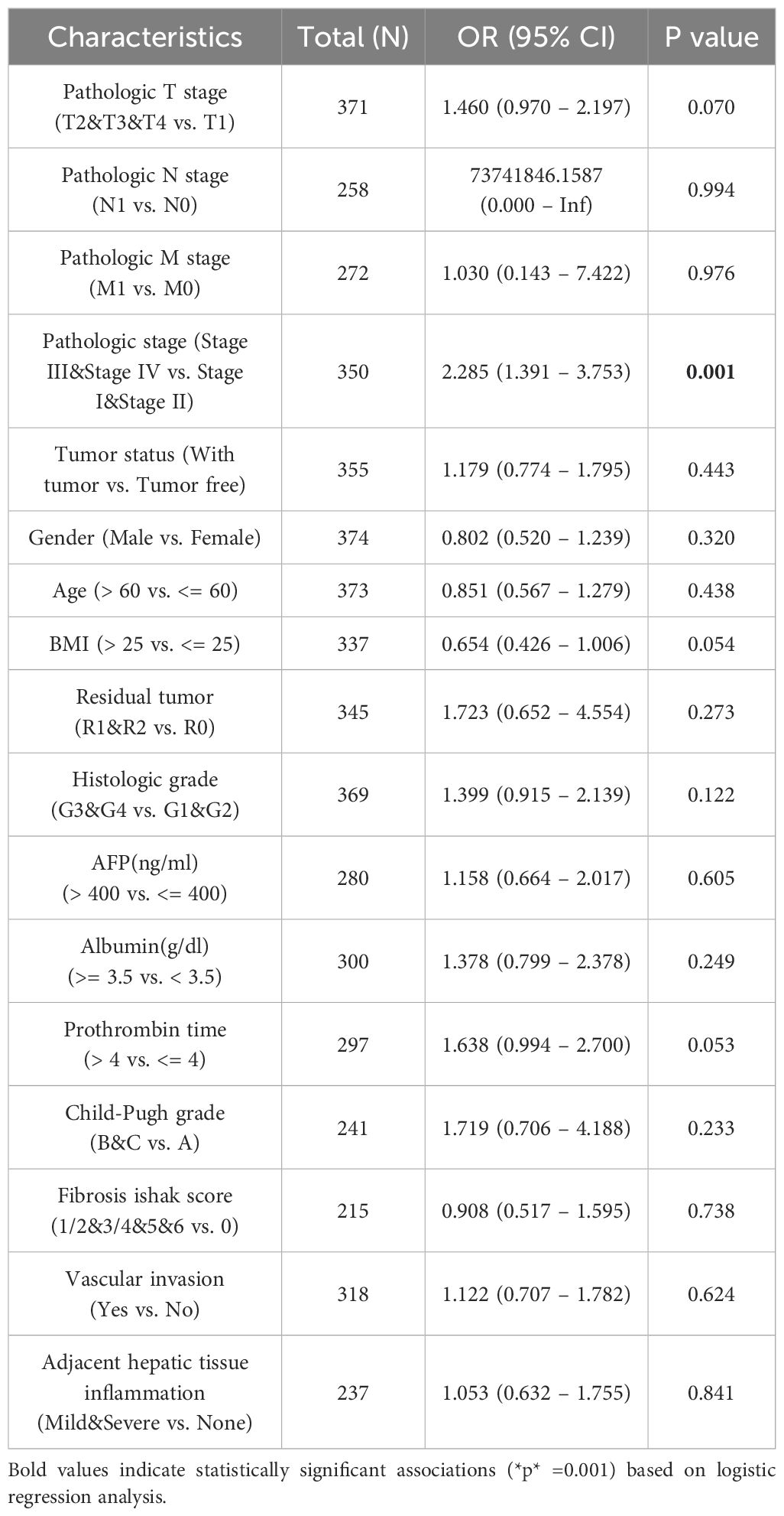 We then detected PIEZO1 association with clinical features across different cancer types. In ACC, tumors exhibited elevated PIEZO1 expression relative to non-tumorous tissues (Figure 3A). For BLCA, higher grades were linked to increased PIEZO1 levels (Figure 3B). In BRCA, PIEZO1 expression was higher in patients with negative Estrogen Receptor (ER) and Progesterone Receptor (PR) statuses (Figures 3C, D). In COAD, adenocarcinoma patients showed heightened PIEZO1 expression (Figure 3E). Additionally, in GBM, elevated PIEZO1 expression correlated with the Wild-Type (WT) IDH status (Figure 3F). An inverse relationship between PIEZO1 expression and histologic grade was observed in KIRC (Figure 3G). Furthermore, in LIHC, the advanced pathologic stage, pathologic N and T stage, were associated with higher PIEZO1 expression (Figures 3H–J). PAAD patients with residual tumors classified as R1 and R2 demonstrated increased PIEZO1 levels compared to those with R0, and higher histologic grades were also associated with elevated PIEZO1 expression (Figures 3K–L). In PCPG, patients with paraganglioma exhibited higher PIEZO1 expression (Figure 3M). Interestingly, PRAD patients with no residual tumor (R0) had higher PIEZO1 expression than those with R1 and R2 (Figure 3N). Lastly, in SARC, patients with metastasis displayed increased PIEZO1 expression (Figure 3O). Elevated PIEZO1 correlates with advanced tumor stages (e.g., LIHC, PAAD) and metastatic status (SARC), indicating its association with aggressive phenotypes. Furthermore, using the TCGA dataset, we conducted a logistic regression analysis to examine the correlation between PIEZO1 expression levels and clinical features among 374 LIHC patients. As shown in Table 1, there was a significant correlation between PIEZO1 expression and pathologic stage (p = 0.001).