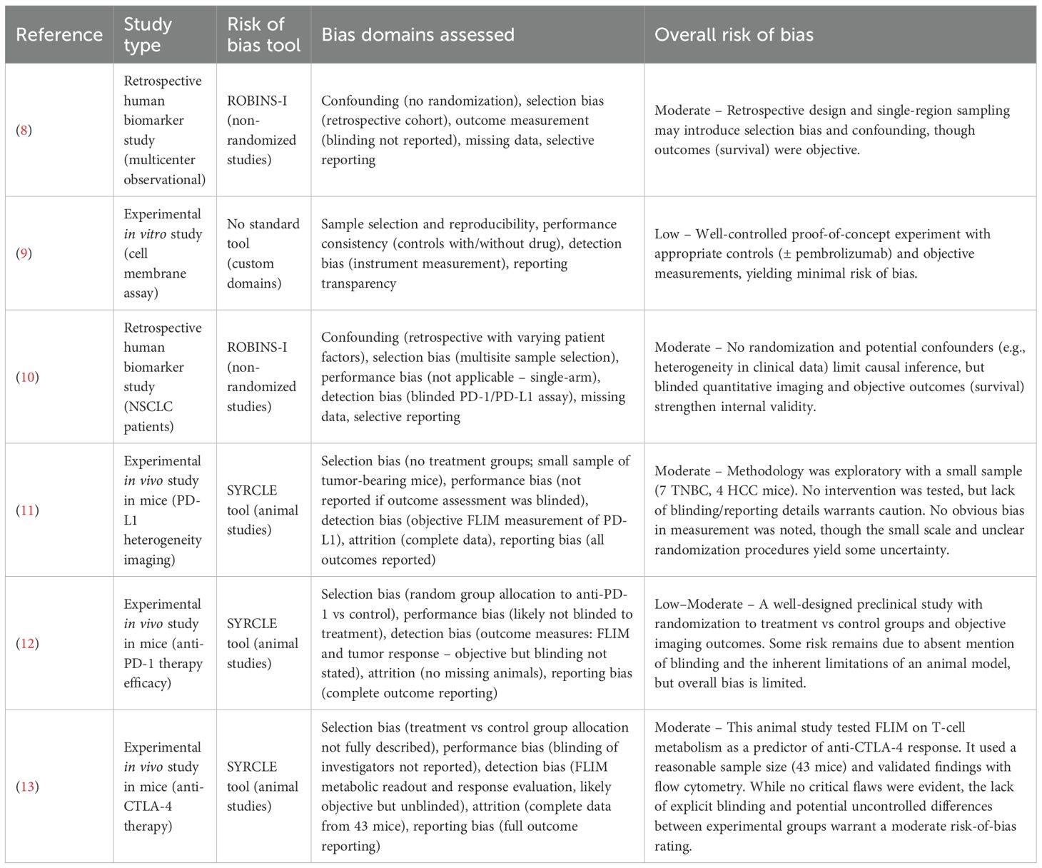 Across the included studies, the overall risk of bias was moderate, Table 1. None of the studies were RCTs, and the two human studies (8, 10) were retrospective cohorts with inherent confounding and selection biases. These observational studies did not properly control for all potential prognostic factors, which could significantly influence the observed association between FLIM-based biomarkers and ICI outcomes. However, objective endpoints have been applied (e.g., survival) and, in one case, a blinded multi-site assay analysis to mitigate measurement bias (Sánchez-Magraner et al., 2023). The in vitro proof-of-concept study was at low risk of bias, benefiting from a controlled experimental setup and objective readouts. The preclinical animal studies were generally well-conducted but still exhibited some risk of bias common to exploratory animal experiments, such as unclear blinding of outcome assessment and, in one case, non-random group assignment. One murine study did implement randomization for therapy vs. control groups, strengthening its internal validity. Overall, while all included studies had methodological limitations (e.g., retrospective design, small sample sizes, or incomplete reporting of blinding), no study was found to have a high or critical risk of bias. This suggests that the current evidence, though preliminary, is not compromised by fatal bias; still, the moderate risk-of-bias across studies underscores the need for cautious interpretation of the findings and highlights the importance of more rigorous future research (e.g., prospective trials) to confirm FLIM’s predictive value.