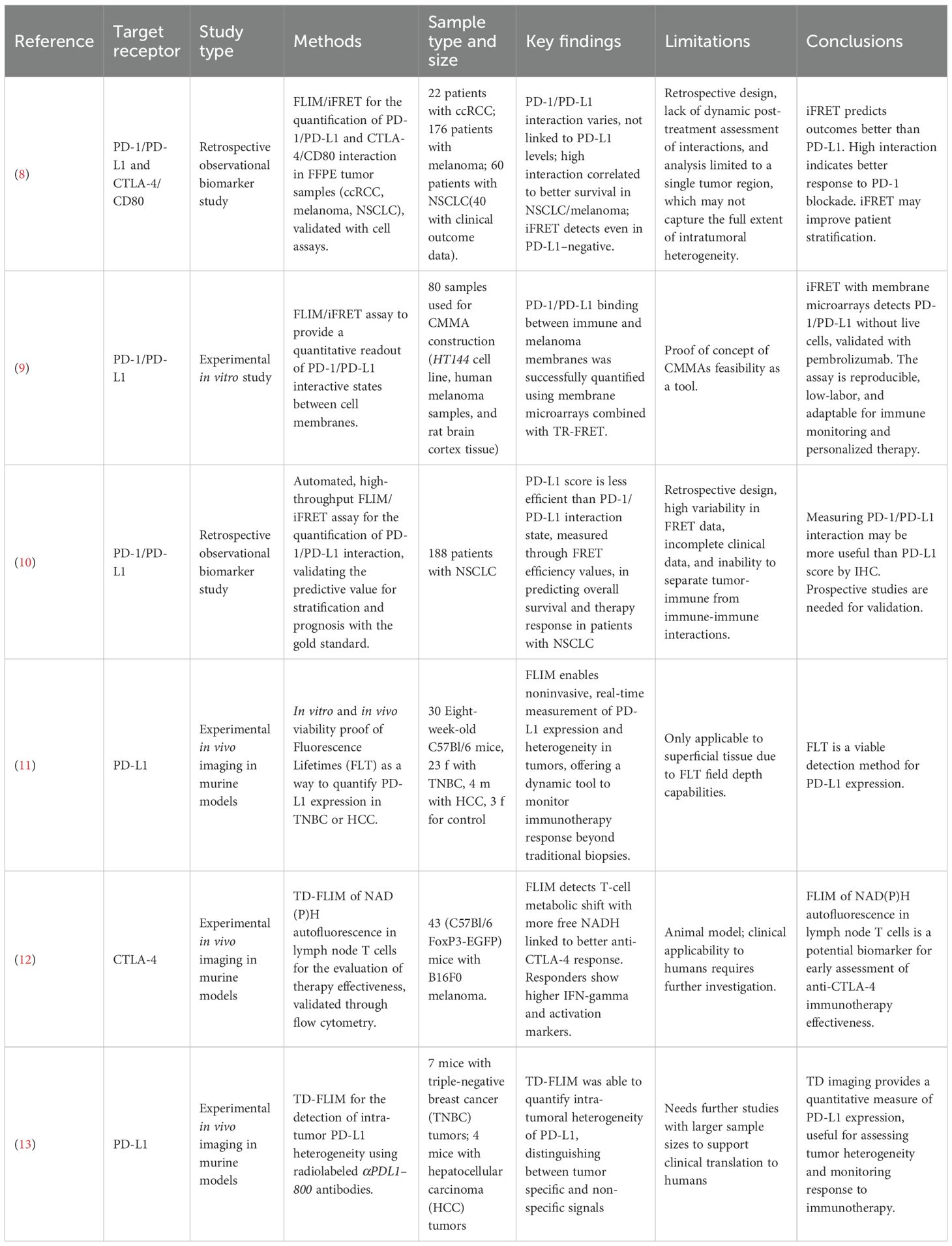 Our results are summarized in Table 2. Among the six articles matching our query, five (8–12) are published studies and one (13) is a preprint. Of these, five (8–11, 13) focus on in-depth analyses of new methods for assessing anti-PD1/PD-L1 therapy response to improve patient stratification, while one (12) explores anti-CTLA-4 immunotherapy by evaluating increased free NADH in tissue samples using FLIM. Three articles investigating PD-1/PD-L1 (8–10) examine the feasibility and correlation between PD-1/PD-L1 interaction (detected by iFRET in ex vivo samples) and patients’ responses to immunotherapy; while the other two (11, 13) analyze the concordance of FLIM in detecting PD-L1 expression levels in in vivo mouse samples and compare these findings with the IHC PD-L1 score. It is worth noting that three of the five PD-1/PD-L1 studies (8–10) were conducted by the same research group, and two (11, 13) by another, potentially contributing to the apparent focus on this pathway. While our dataset is limited, this distribution may still mirror broader trends in the field, with CTLA-4 representing a less-examined but promising direction for future research.