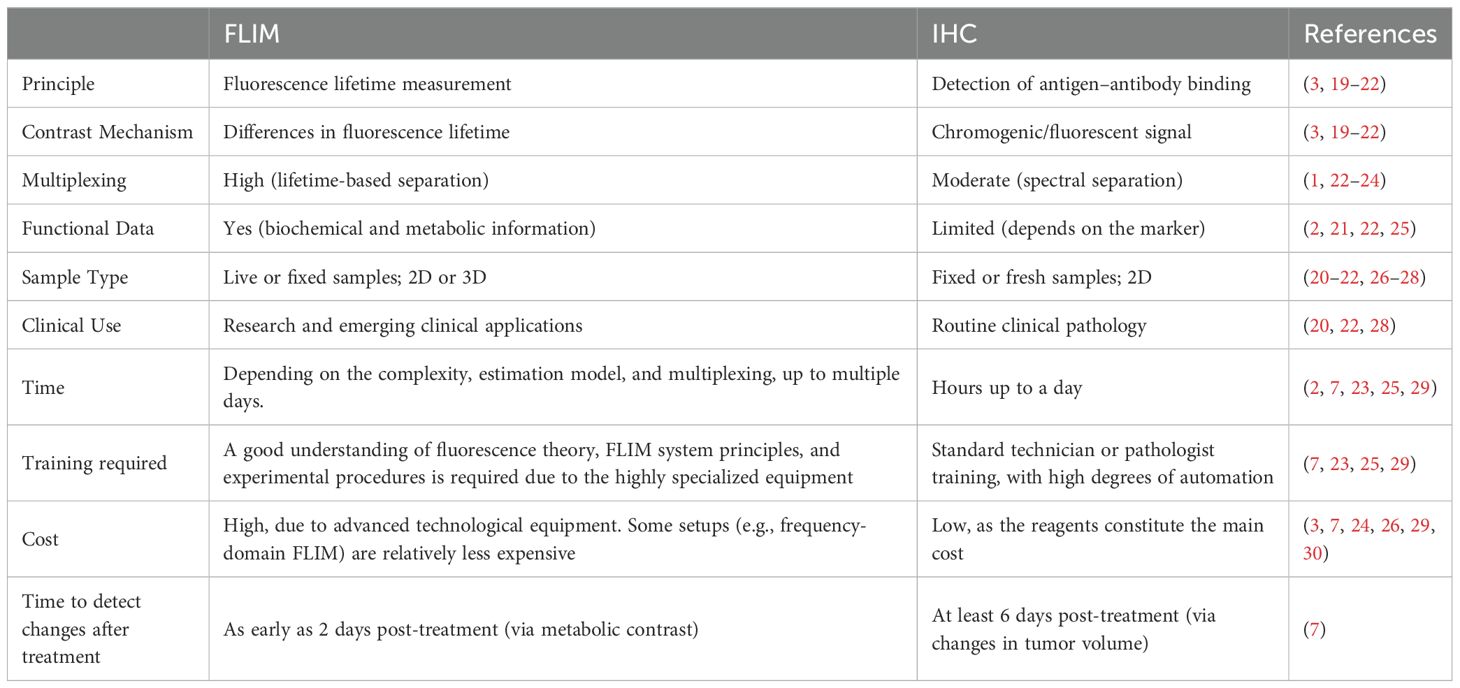 FLIM and FRET are reliable imaging techniques that could overcome some of the limitations of IHC. Table 3 shows a direct comparison between the technical and practical capabilities of IHC and FLIM. While IHC is the gold standard for predicting the body’s response to various ICIs, its limitations have become increasingly evident (2). Despite the scarce research on this topic, the usage of FLIM and FRET to test ICI efficacy have shown promising results by providing real-time, non-invasive insights into molecular interactions such as PD-1/PD-L1 engagement, surpassing the static and limited biopsy samples used in IHC. FLIM detected treatment-induced changes in tumors in vivo just 2 days post-treatment, which is earlier than detectable changes in tumor volume (31). Furthermore, FLIM-FRET allows for the visualization of checkpoint interactions at a microscopic level, providing crucial information about the functional state of these molecules as shown by iFRET which detected significant interaction states in patients who were PD-L1 negative according to IHC (8). FLIM can help detect cells’ in vivo metabolism with no phototoxicity and in real-time. FLIM’s capability to quantify functional interactions offers a more comprehensive approach, potentially improving the stratification of patients for immunotherapy and reducing the ambiguity associated with IHC-based assays. It is important to underline that FLIM finds its greatest potential in vivo and relies on the fact that its results, unlike traditional fluorescence microscopies, are not dependent on the change in fluorescence intensity but on the lifetime. FLIM, with or without FRET, still suffers from major drawbacks that vary depending on its specific application. The use of FLIM technology in the analysis of ex vivo samples proves it is non-superior to more widespread methods since metabolic microenvironment characteristics are lost in the transition from the in vivo to the ex vivo, limiting its ability to provide accurate insights into molecular interactions.