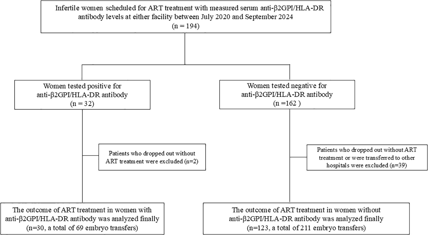 This prospective observational study was conducted between July 2020 and September 2024 at the Teine Keijinkai Hospital and the University of Yamanashi Hospital in accordance with the principles outlined in the Declaration of Helsinki. It was approved by the institutional review boards of both institutions (Approval nos. 2-020090–01 and 2-023209-00, respectively). The study enrolled women with infertility who were scheduled for ART and underwent serum anti-β2GPI/HLA-DR antibody measurements at either facility between July 2020 and July 2023, and their pregnancy outcomes were monitored until September 2024. Women with missing data and a history of chronic hypertension, diabetes mellitus, endocrine diseases, cardiovascular diseases, or malignancies were excluded.