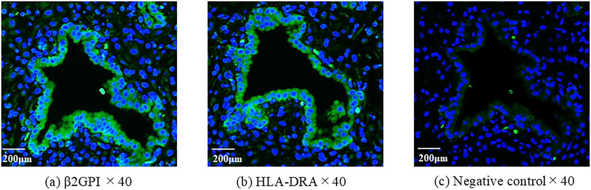 Immunofluorescent staining was performed to examine the expression of β2GPI/HLA-DR antigens in the endometrium. β2GPI and HLA-DR were expressed coordinately on the epithelial cells within the eutopic endometrium of a patient with anti-β2GPI/HLA-DR antibody (Figure 2).