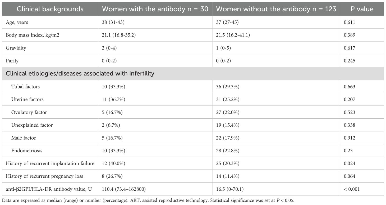 Table 1. Clinical backgrounds of ART women who tested positive or negative for anti-β2GPI/HLA-DR antibody.